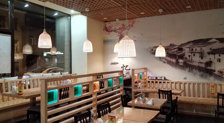 Интерьер заведения оформлен с учетом современных строительных тенденций. Дизайну в большом количестве присущи элементы китайской культуры и колорита (иероглифы, картины, деревянная мебель, плетёные светильники). В целом интерьер смотрится стильно, сдержанно и оригинально. Для малышей в заведении предусмотрены специальные детские стульчики и есть отдельное детское меню. На внешней территории ресторана находится бесплатная охраняемая парковка.