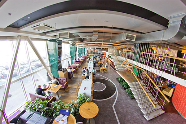 Ресторан «Набережная» представляет собой пример того, как выглядит добротное и радушное немецкое местечко для широкой публики: светлая мебель, двухэтажное просторное помещение, длинная стойка бара и уютные лампы, освещающие столики. Последний штрих — большие окна с видом на безмятежную водную гладь и тёплый свет от отливающих медью чанов в глубине зала.