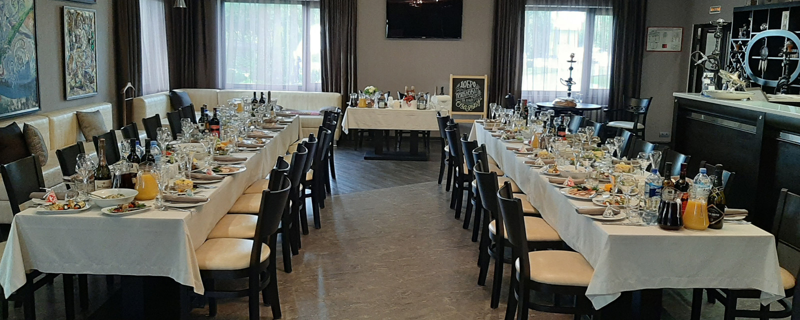 Двери ресторана открыты для дружеских компаний, решивших провести летние выходные за городом. Для расслабляющей трапезы на открытом воздухе, у ресторана предусмотрено несколько автономных беседок.