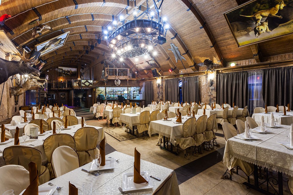 Интерьер комплекса можно сравнить с охотничьей избой из-за обилия натуральных материалов, использованных в отделке помещений. Бревенчатые и каменные стены создают иллюзию жилища настоящего охотника, а интересные светильники и маленькие водоёмы делают атмосферу ещё более уютной. На стенах красуются чучела птиц и животных, картины, ружья и прочие атрибуты. Подобное дизайнерское решение дарит посетителям особое чувство гармонии, сравнимое с удовлетворением после удачной охоты, располагает к комфортному отдыху.