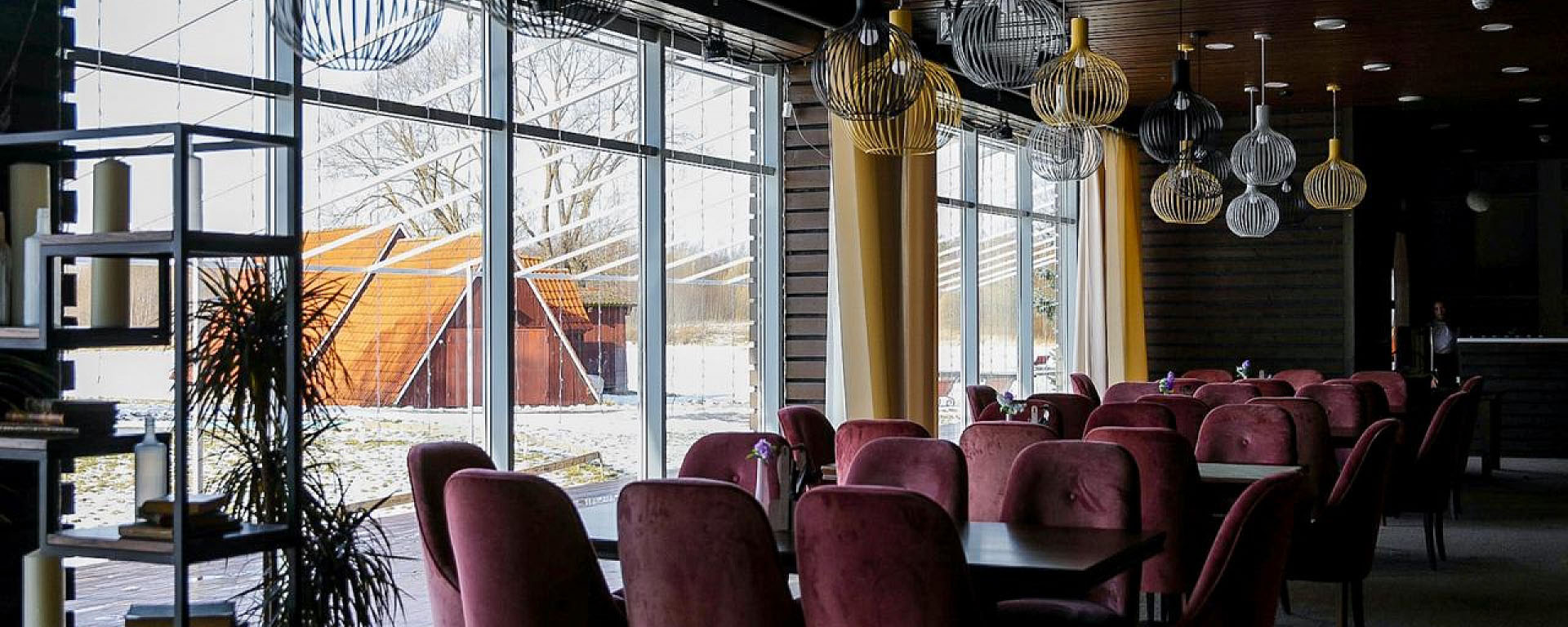 Зал с понарамными окнами и видом на Колкуновский залив и Волгу, оформление зала в европейском стиле, открытое летнее патио.