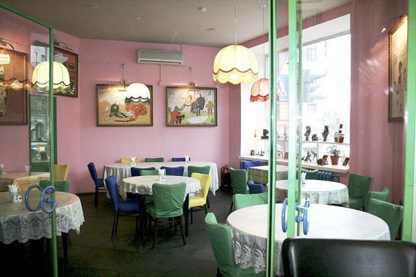 Клуб Петрович– это колоритное сочетание духа старой-доброй коммуналки с атмосферой советской столовой. На полу – его махровое величество ковёр, разноцветные стульчики (поклон детсаду, надо полагать), бабушкины абажуры, портретные статуэтки на полочках и множество вырезанных из старых журналов картинок по стенам ресторана. Мгновенное погружение во времена молодости-детства обеспечено.