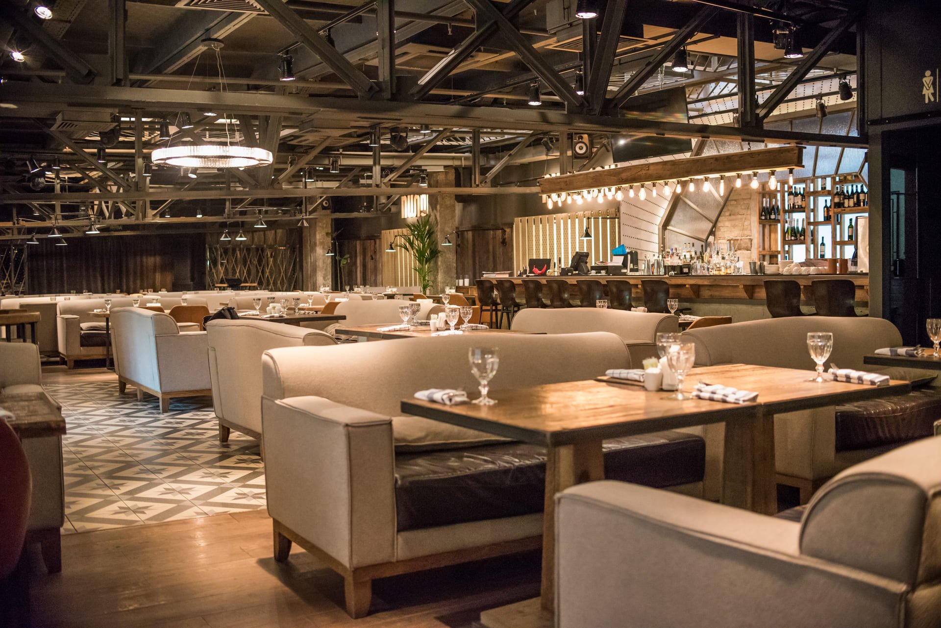 Интерьер ресторана «Пилпили» сочетает в себе черты модного стиля «лофт» с природными мотивами направления «эко». В отделке повсеместно используются натуральные деревянные текстуры, а также стеклянные перегородки и металлические конструкции. Коммуникации не прикрыты и составляют часть организованного пространства, свет дают аккуратные люстры. Здесь мягкая удобная мебель, высокие столики и красивый вид из окна. Тропические нотки в атмосферу вносят живые комнатные растения в больших горшках.