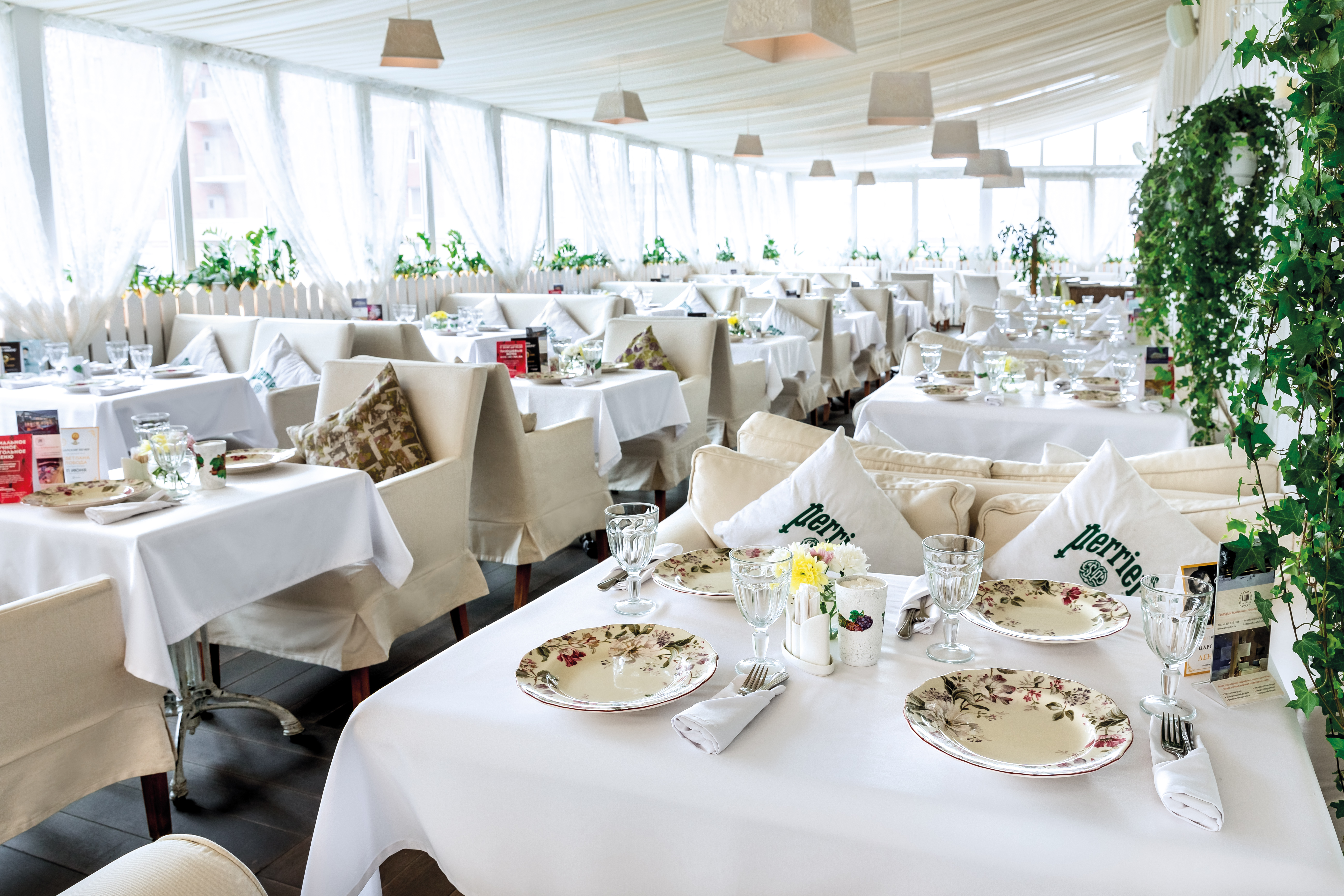 Интерьер ресторана напоминает просторную веранду или гостиную в загородном доме: отделка натуральным светлым деревом, клетчатые кресла, невысокие диваны, живая зелень в кадках.