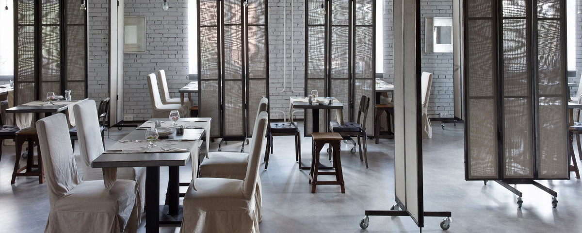 «Чистый LOFT» – идея состояла в том, чтобы пространство легко трансформировалось. Стационарны только книжный шкаф, который разграничивает зоны, и барная стойка. Ключевой элемент – мобильные ширмы, сделанные с использованием холста грубой структуры и ручной выделки. Наложение двух полотнищ на просвет дает эффект муара. Интерьер имеет монохромные цвета бетона, кирпича и металла, которые разбавлены «яркими пятнами» картин голландских художников 17-го века.