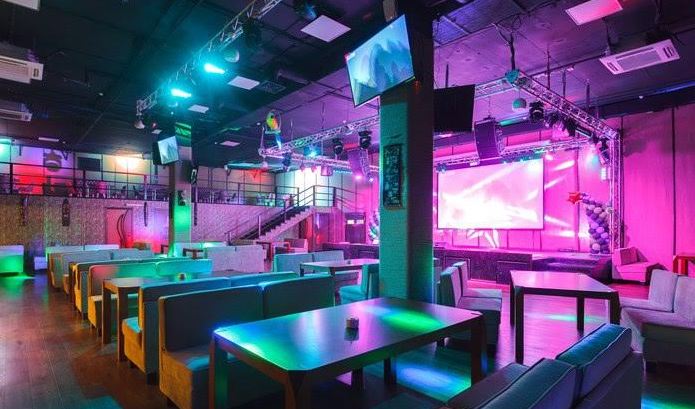 Двухярусовый зал. Первый этаж бар, танцпол, сцена, 100 посадочных мест, 2 й этаж-балкон, так же 100 посадочных мест. Большой экран за сценой, сцену и экран видно как с первого так и со второго этажа.
