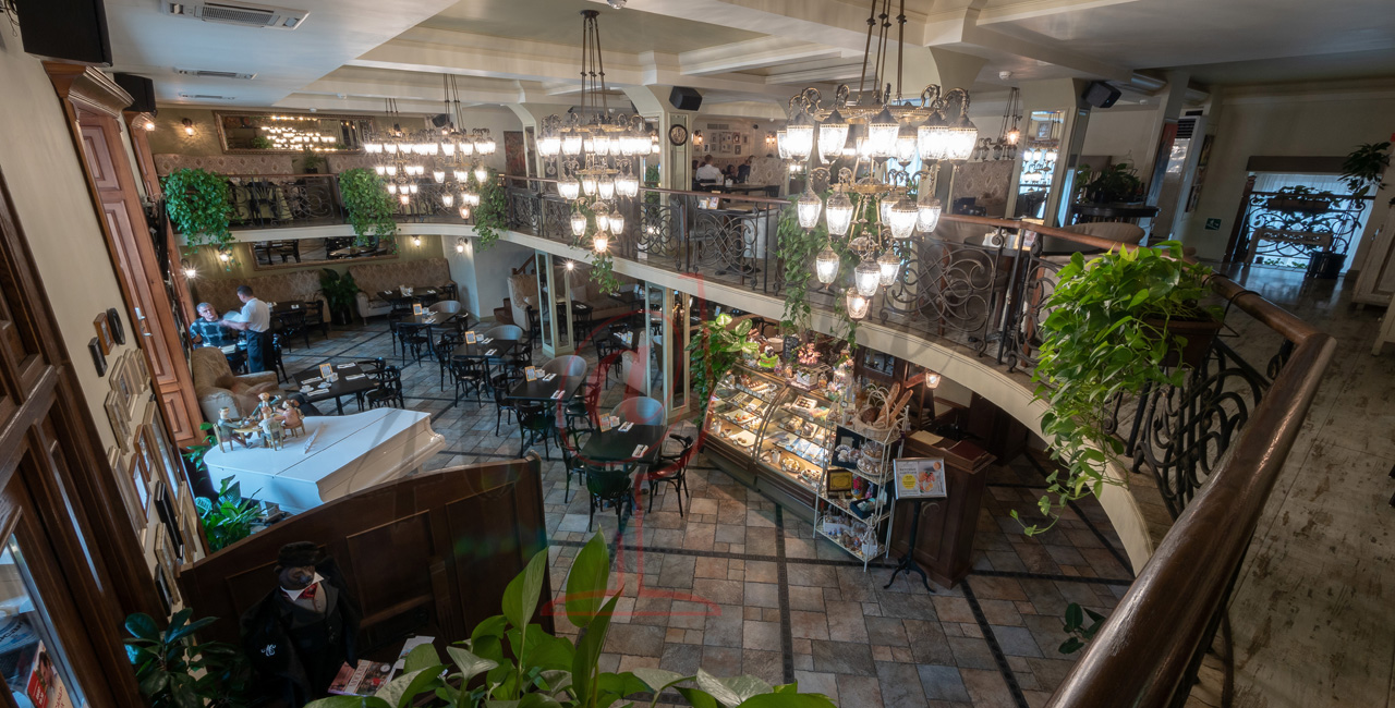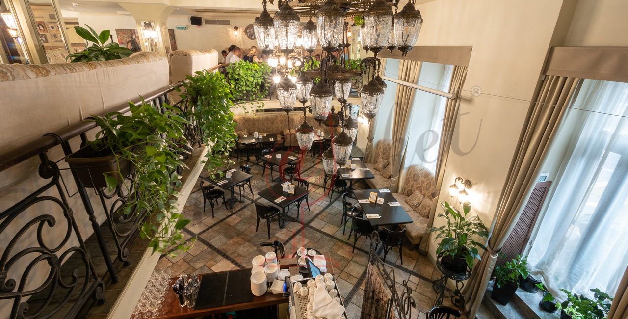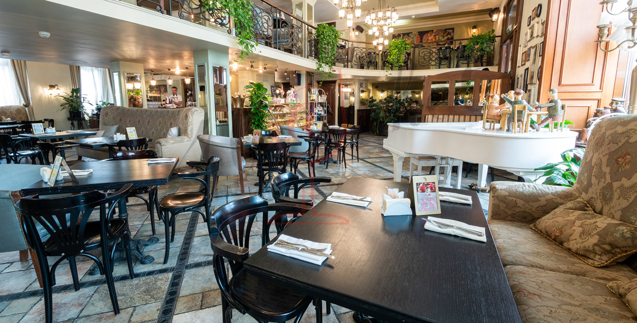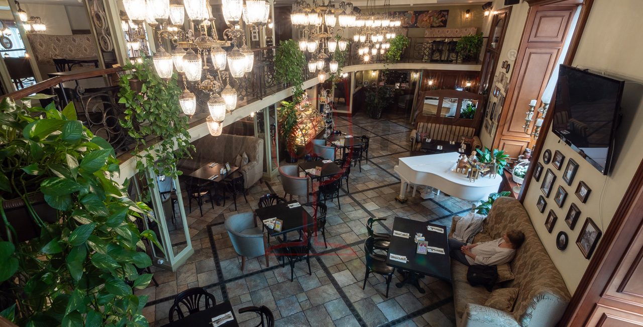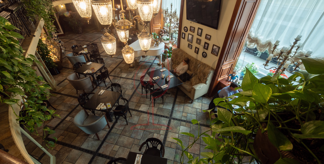 Почувствуйте дух аристократической атмосферы: высокие потолки с лепниной, закрашенные темной масляной краской, кованые перила, большие люстры с хрустальными подвесками и старинное фортепиано со своей загадочной историей. Классические столики соседствуют со стильными диванами.