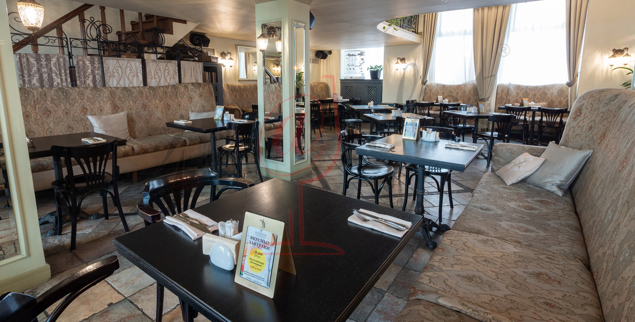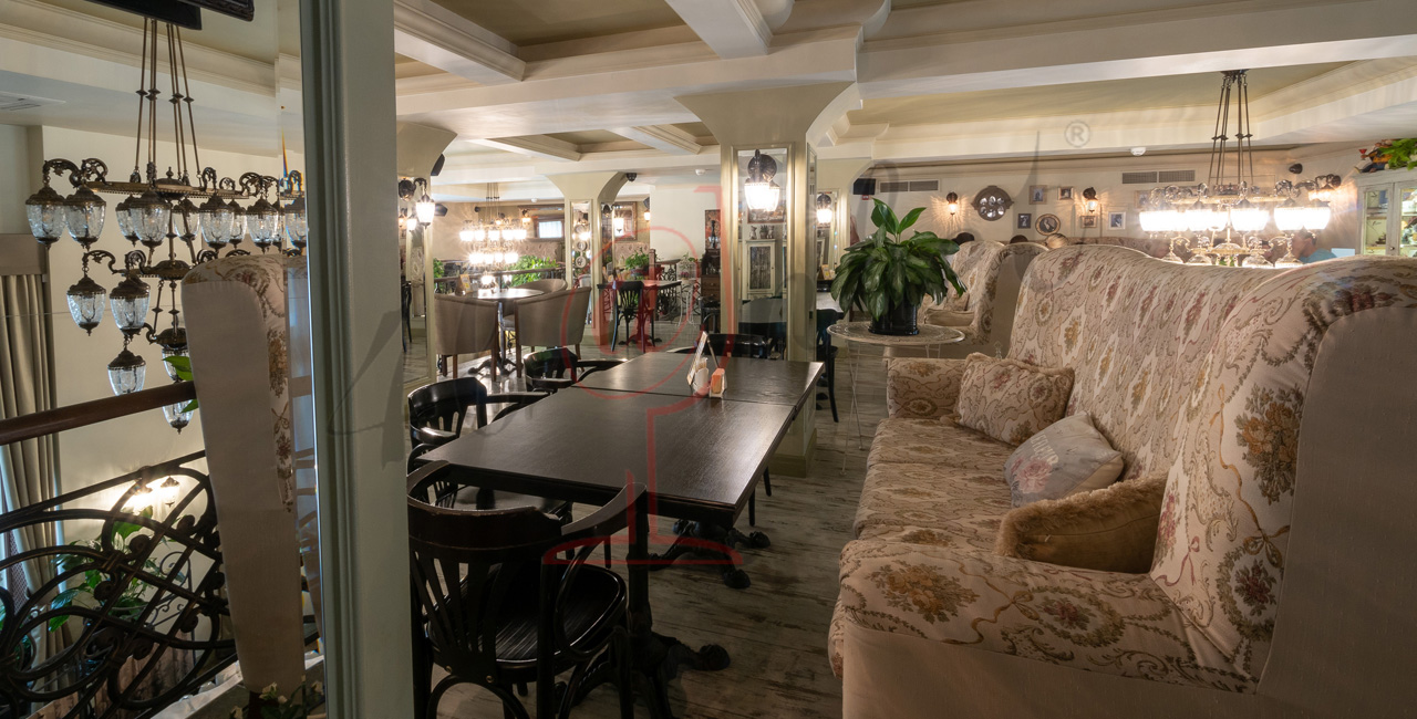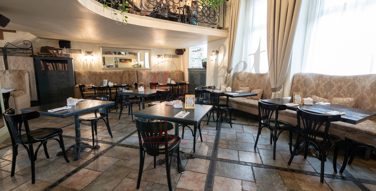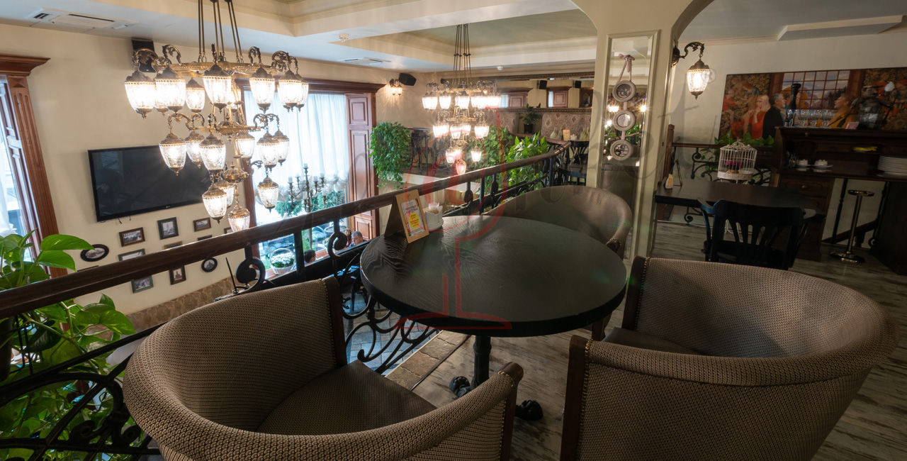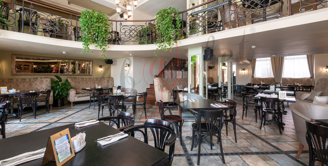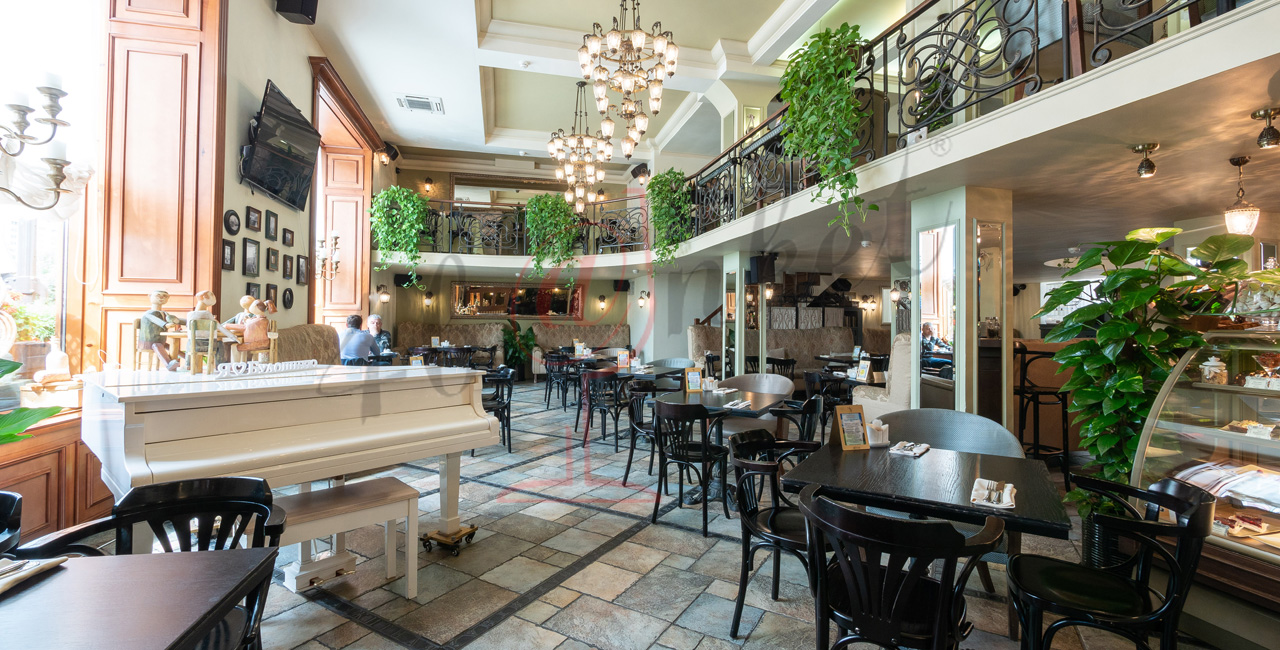 Почувствуйте дух аристократической атмосферы: высокие потолки с лепниной, закрашенные темной масляной краской, кованые перила, большие люстры с хрустальными подвесками и старинное фортепиано со своей загадочной историей. Классические столики соседствуют со стильными диванами.