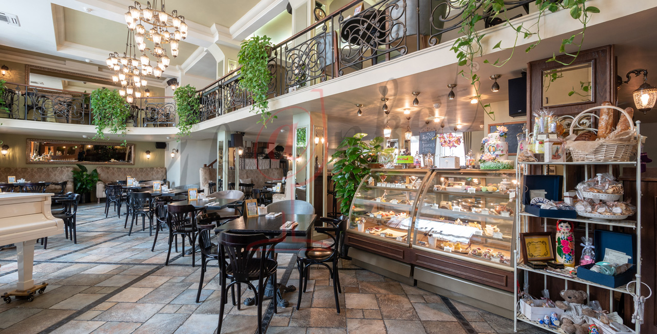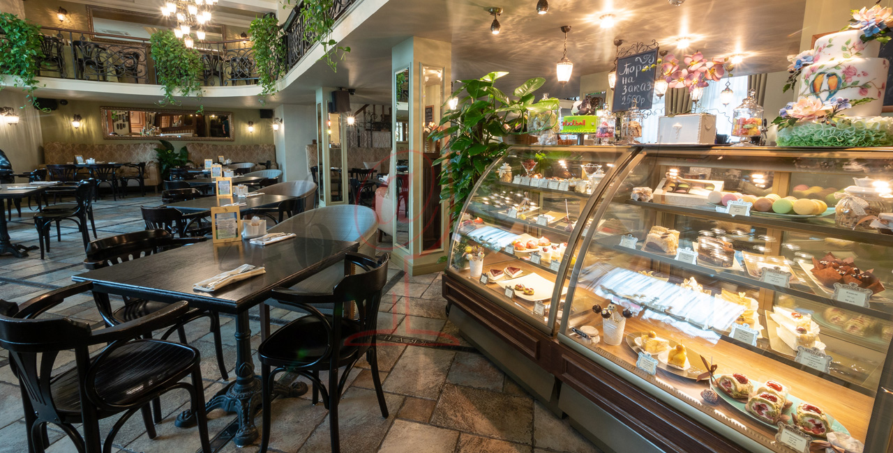 Концептуальной деталью интерьеров является витрина с разнообразнейшими кондитерскими изделиями.