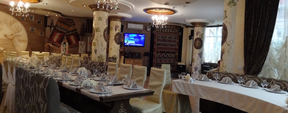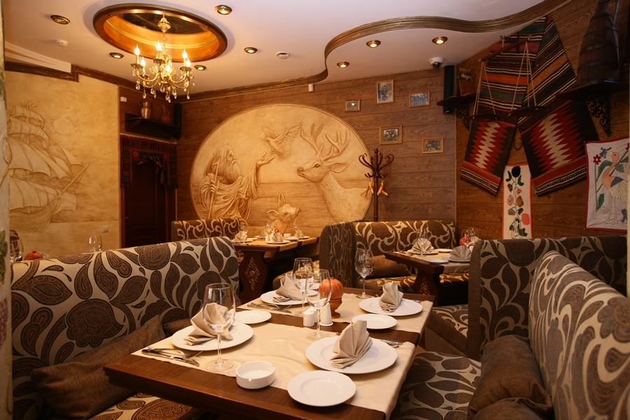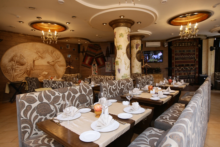 Интерьер располагает теплой атмосферой, которую придает мягкая мебель, колоны с орнаментами виноградной лозы и элементы Кавказского быта, позволят окунуться в старинное, настоящее, отображающее историю Армянского народа, а живая музыка наполнит Ваш отдых незабываемыми впечатлениями и романтизмом.