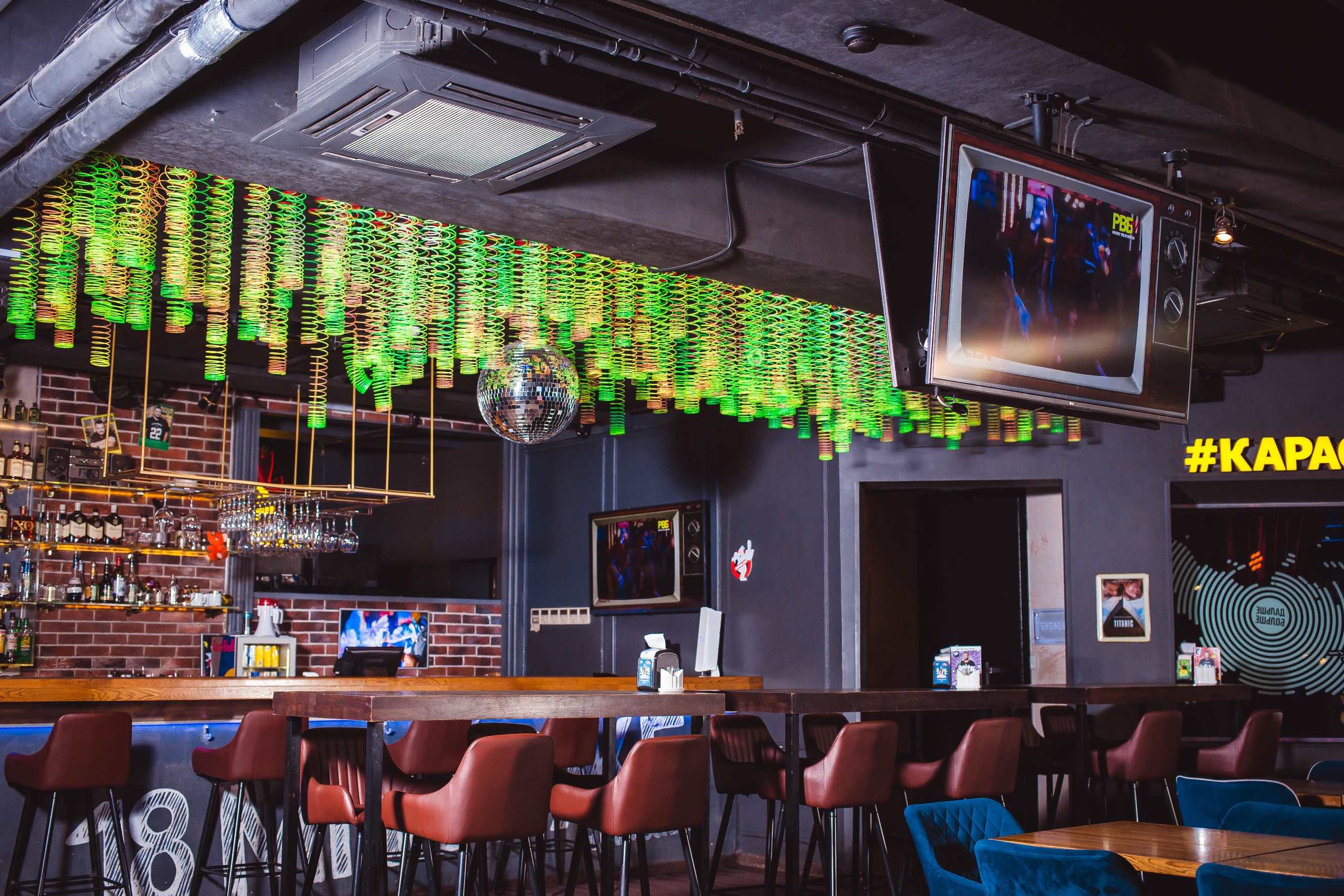 Всё взаведении, начиная отменю изаканчивая интерьером, выполнено встиле 90-х. Регулярные выступления приглашенных артистов, множество яркой атрибутики ифирменный коктейль «Алёшка» дарят гостям возможность вспомнить всё самое интересное изушедшего десятилетия. Помимо этого, любой желающий может исполнить любимые хиты этого или ушедшего десятилетия вуютных вип-комнатах. Здесь, даже втрадиционно тусклые длятусовочной жизни будни, царит буйное веселье— все поют, пьют итанцуют.