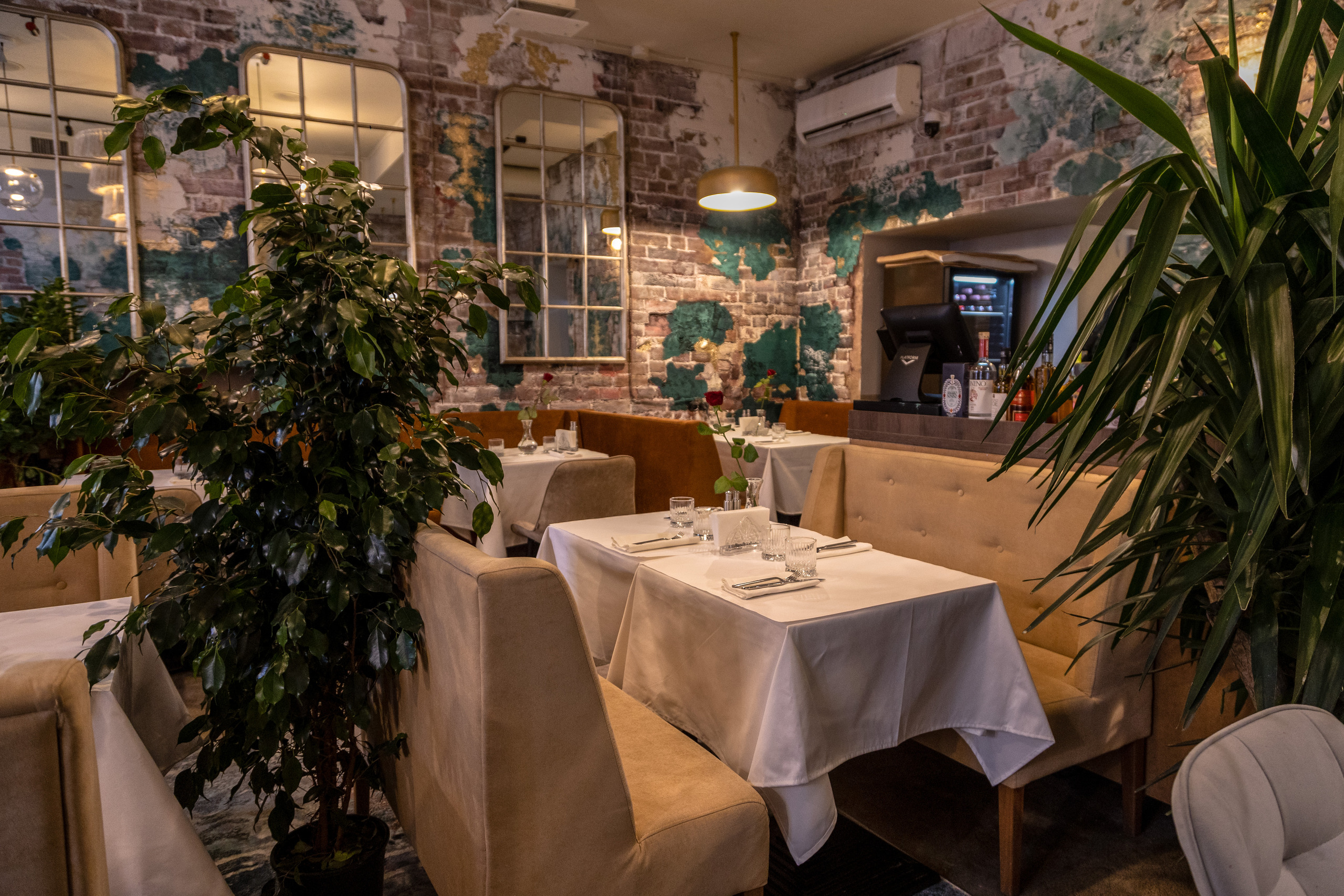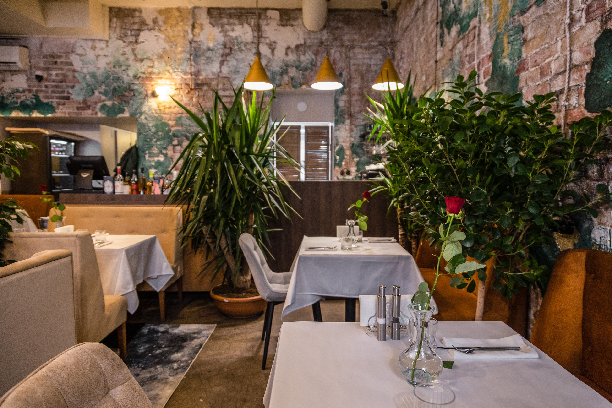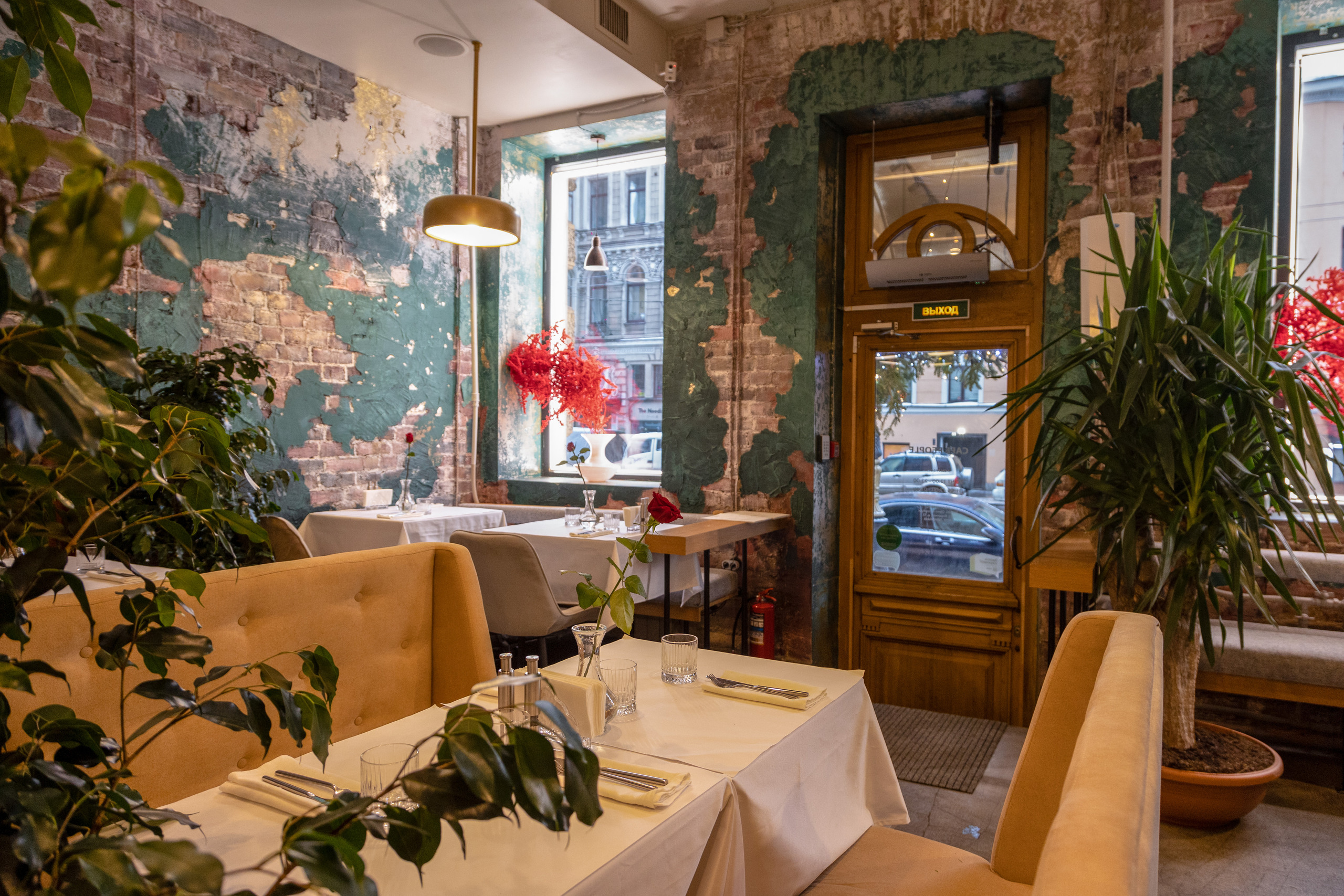 Ресторан, расположенный в центре города, встречает гостей залом, полным зелени — в лучших традициях южного лета. Пышные растения, деревья в напольных кашпо гармонируют с мазками изумрудной краски, художественно разбросанной по кирпичным стенам. Тему старины поддерживают зеркала в винтажном стиле. В зале расставлены велюровые диванчики горчичного цвета, столики накрыты белыми скатертями в пол, на каждом — миниатюрный цветущий букет. Подоконники украшены вазами из фарфора и керамики.