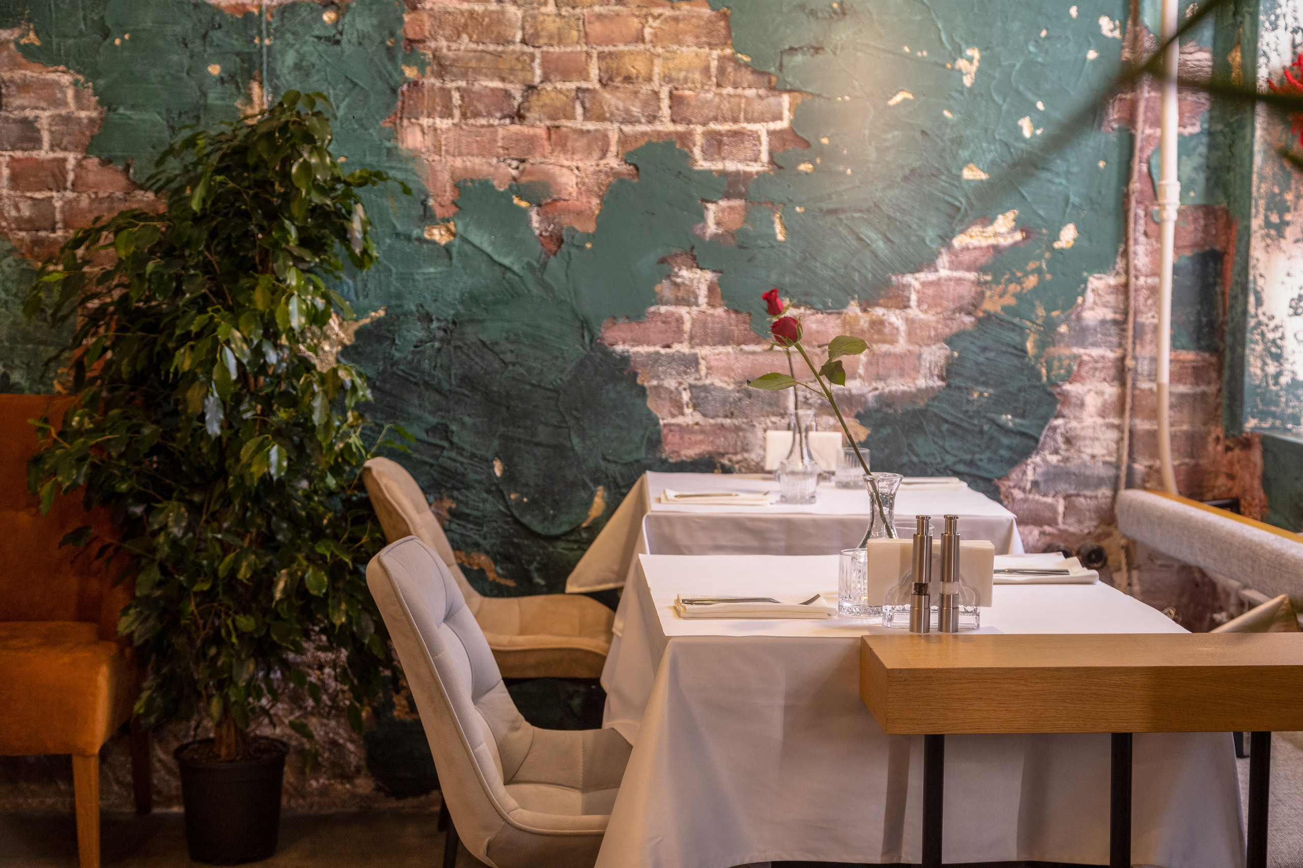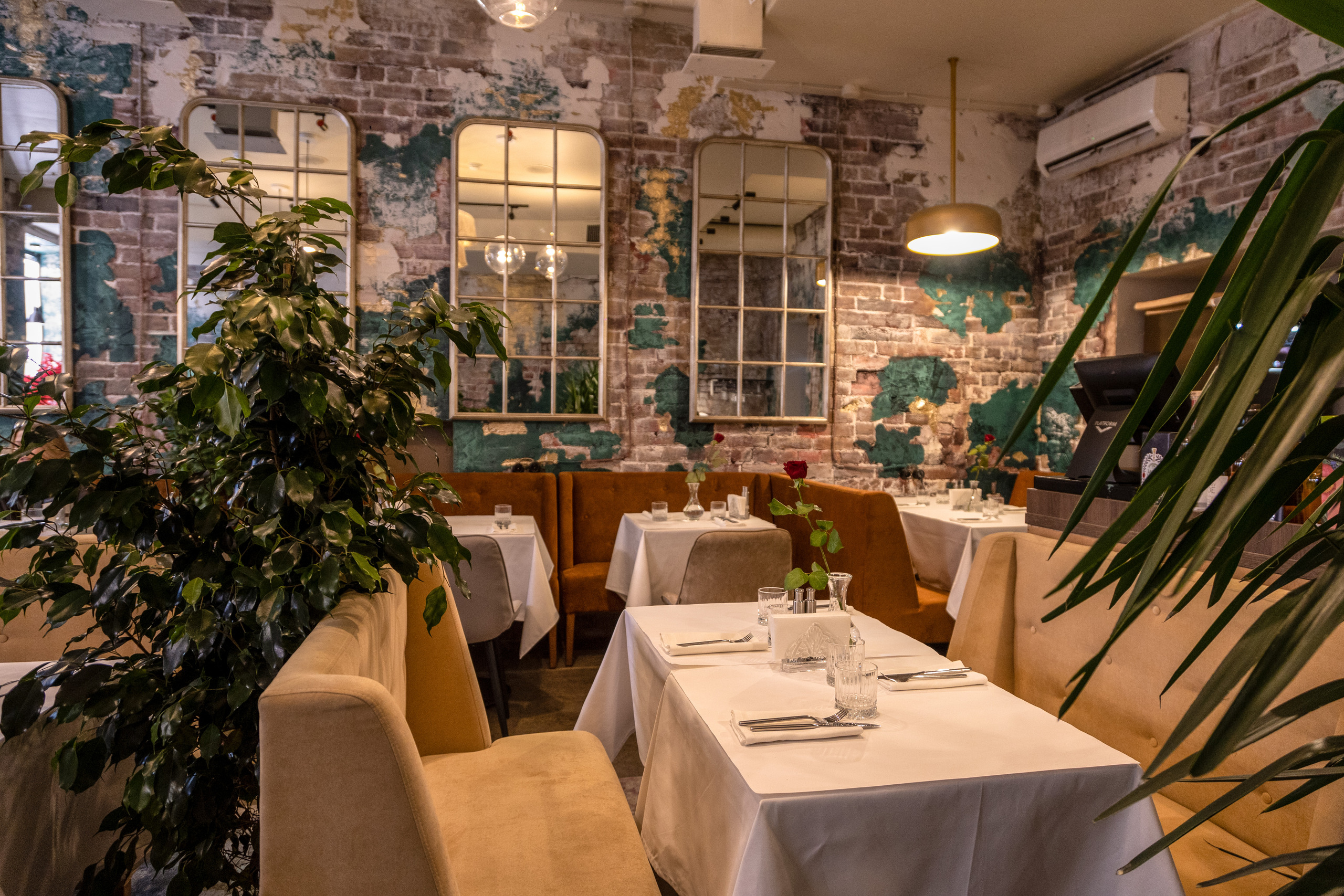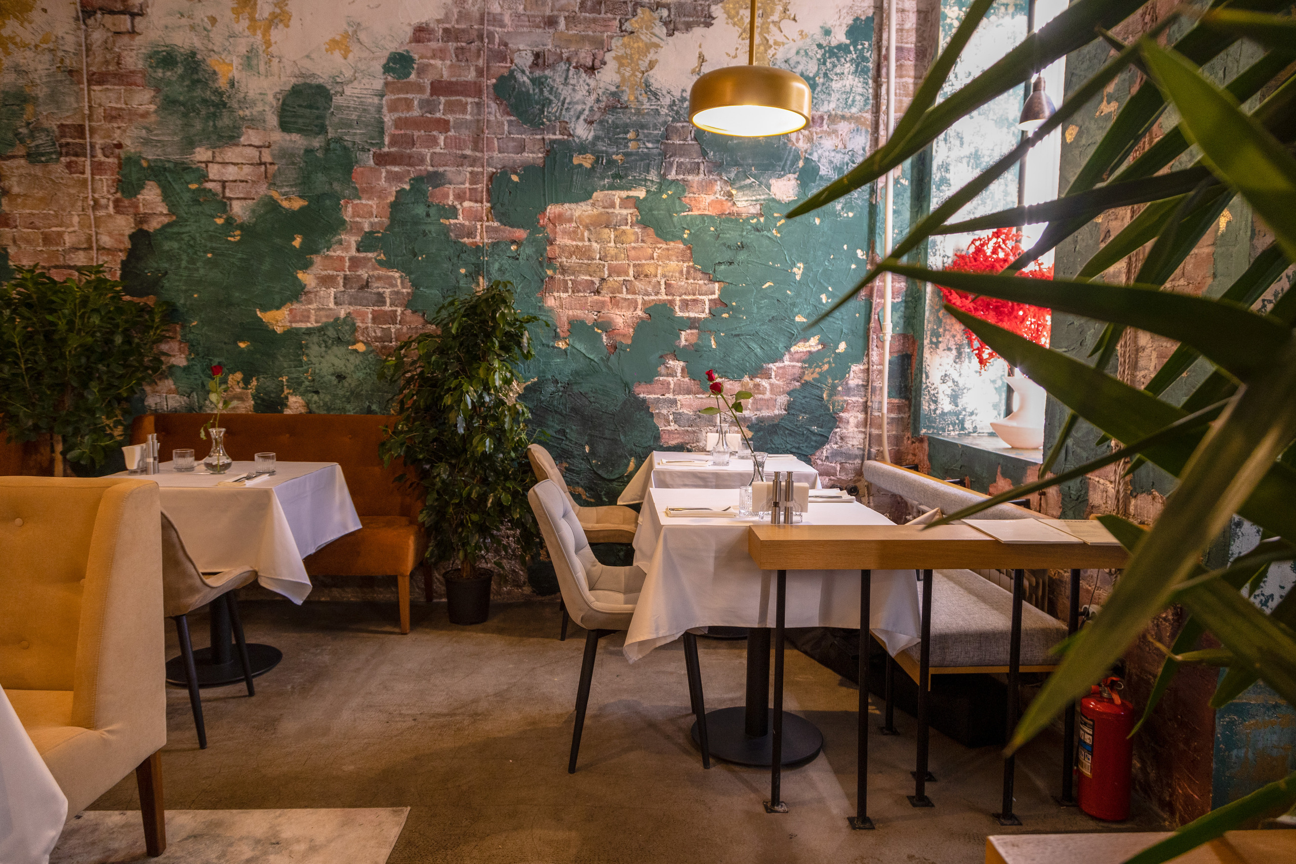 Ресторан, расположенный в центре города, встречает гостей залом, полным зелени — в лучших традициях южного лета. Пышные растения, деревья в напольных кашпо гармонируют с мазками изумрудной краски, художественно разбросанной по кирпичным стенам. Тему старины поддерживают зеркала в винтажном стиле. В зале расставлены велюровые диванчики горчичного цвета, столики накрыты белыми скатертями в пол, на каждом — миниатюрный цветущий букет. Подоконники украшены вазами из фарфора и керамики.