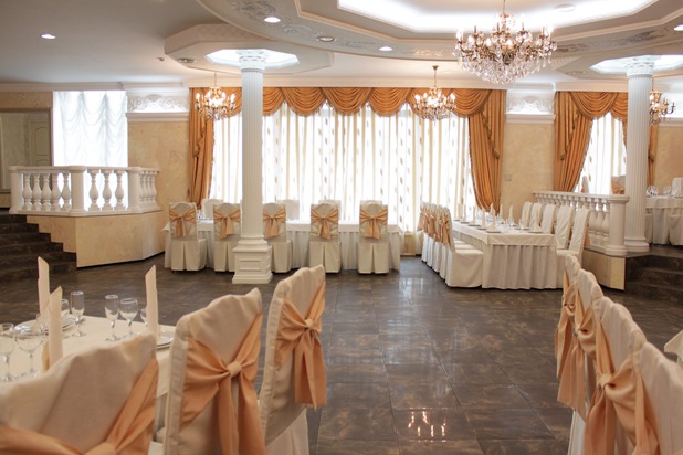 Ресторан со своей пивоварней. Интерьер в теплых персиковых тонах. Деревянные колонны, драпировки на окнах, скатерти. Из украшений - большие аквариумы с рыбками. Подходит для банкетов.