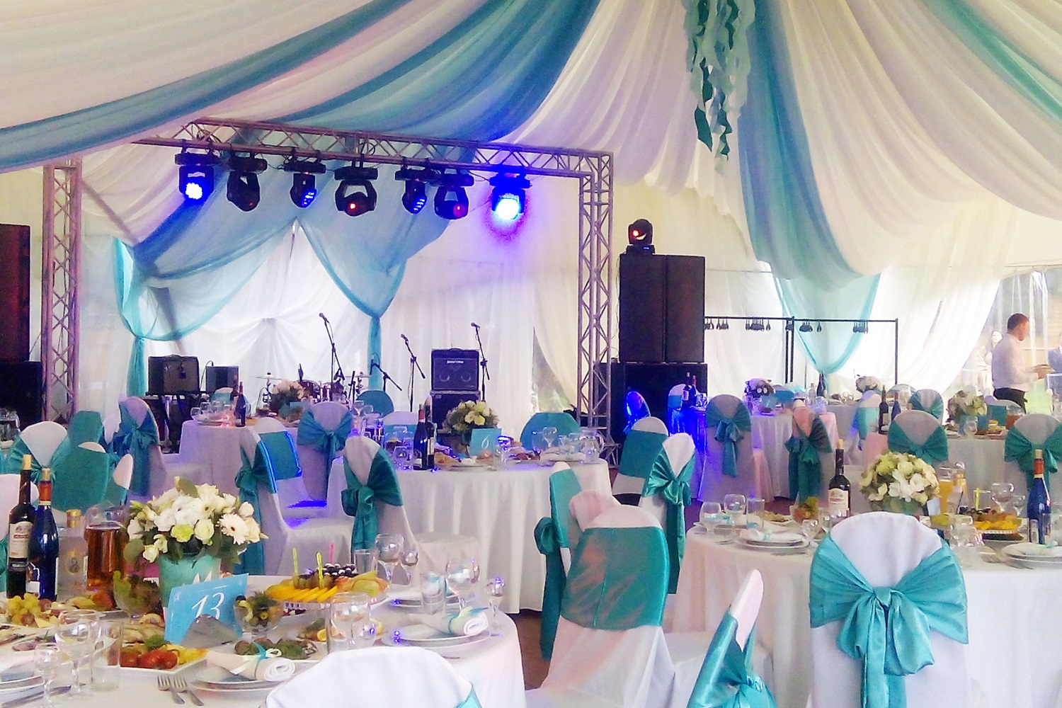 Белоснежный шатер с открытой верандой на берегу водохранилища с великолепным видом на большую воду. Шатёр полностью задрапирован. Драпировка цвет белый. Дополнительный цвет любой. Шатёр арочный. Площадь шатра 400 кв.м. (20х20м).