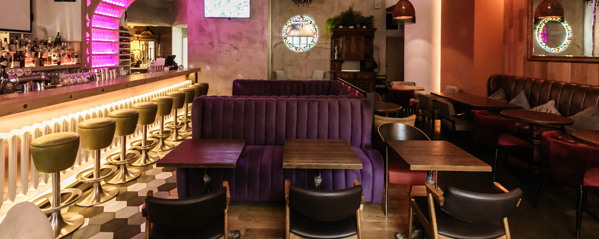 Основной зал с широкой барной стойкой и мягкими диванами идеально подойдет для небольшого мероприятия.