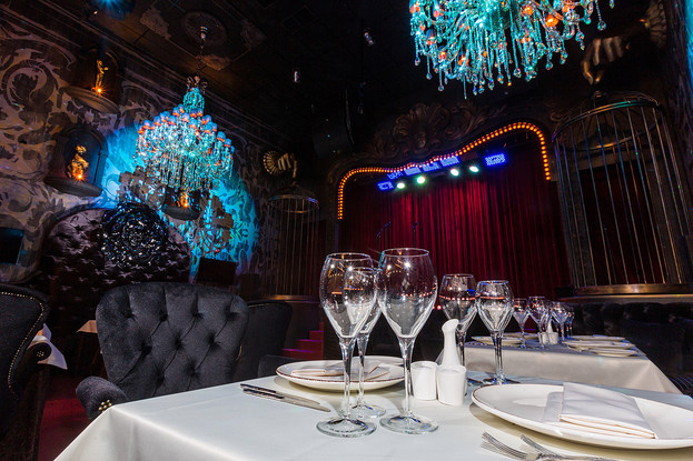 Гостей ресторана встречает консьерж. Здесь есть основной зал сосценой,вип-комната, рассчитанная накомпанию до15 человек, идве ложи, напоминающие театральные,—вних может разместиться до10 гостей. Последние идеально подходят для тех, кто любит уединение: ложи располагаются набалконе над основным залом иоформлены красными бархатными шторами, которые позволяют скрыться отлишних глаз. Изосновных элементов интерьера—многоярусные хрустальные люстры, массивные диваны икресла, обитые бархатом, мозаика иразличные позолоченные детали. Все это гармонично дополняют сложное концертное освещение ипрофессиональная музыкальная система, дающая возможность вполной мере проявить свои вокальные таланты. Апри необходимости напомощь придутбэк-вокалистки, которые сделают выступление безупречным.