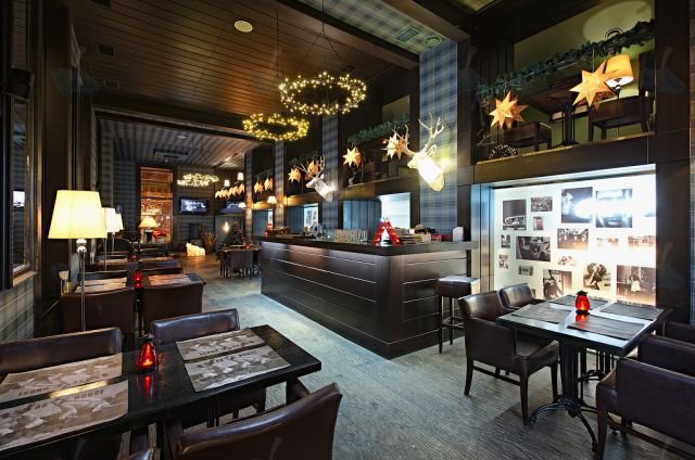 Интерьер залов Стейк Хаусавыполнен в стиле классического ресторан-бара премиум-класса. Просторные залы первого этажа с тяжёлой тёмной мебелью отлично контрастируют со стильной расцветкой стен, украшенных фотокарточками знаменитостей со всего мира. Более тёмные залы второго этажа с низкими сводчатыми потолками создают симпатичные интимные обеденные зоны – и это пространство просто идеально для свиданий.