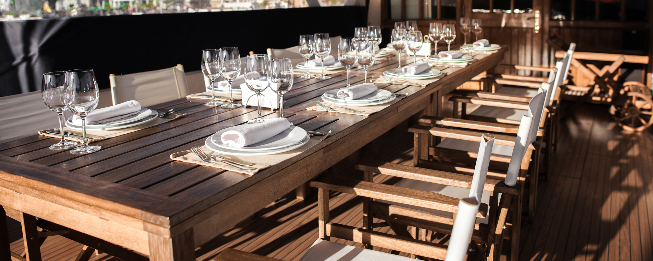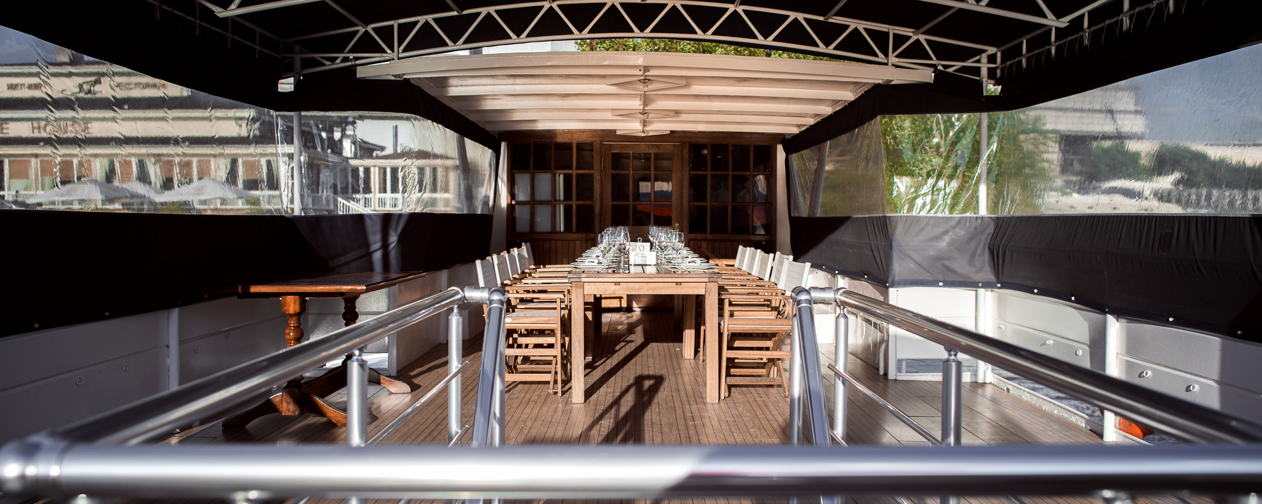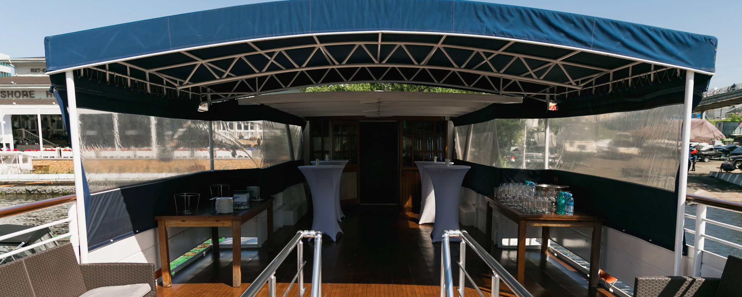 Верхняя палуба - частично крытая терраса с великолепным обзором. Здесь могут быть организованы лаундж зона с мебелью из ротанга или велком-фуршет с коктейльными столами.