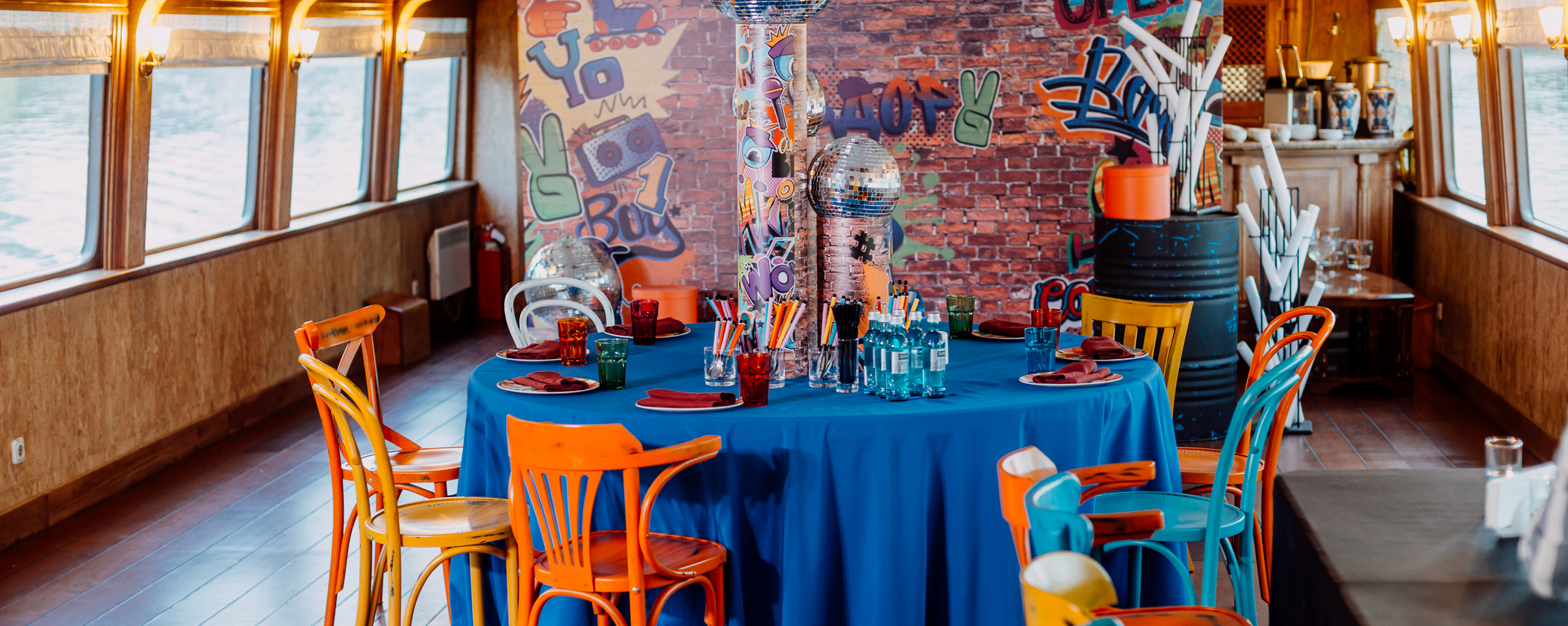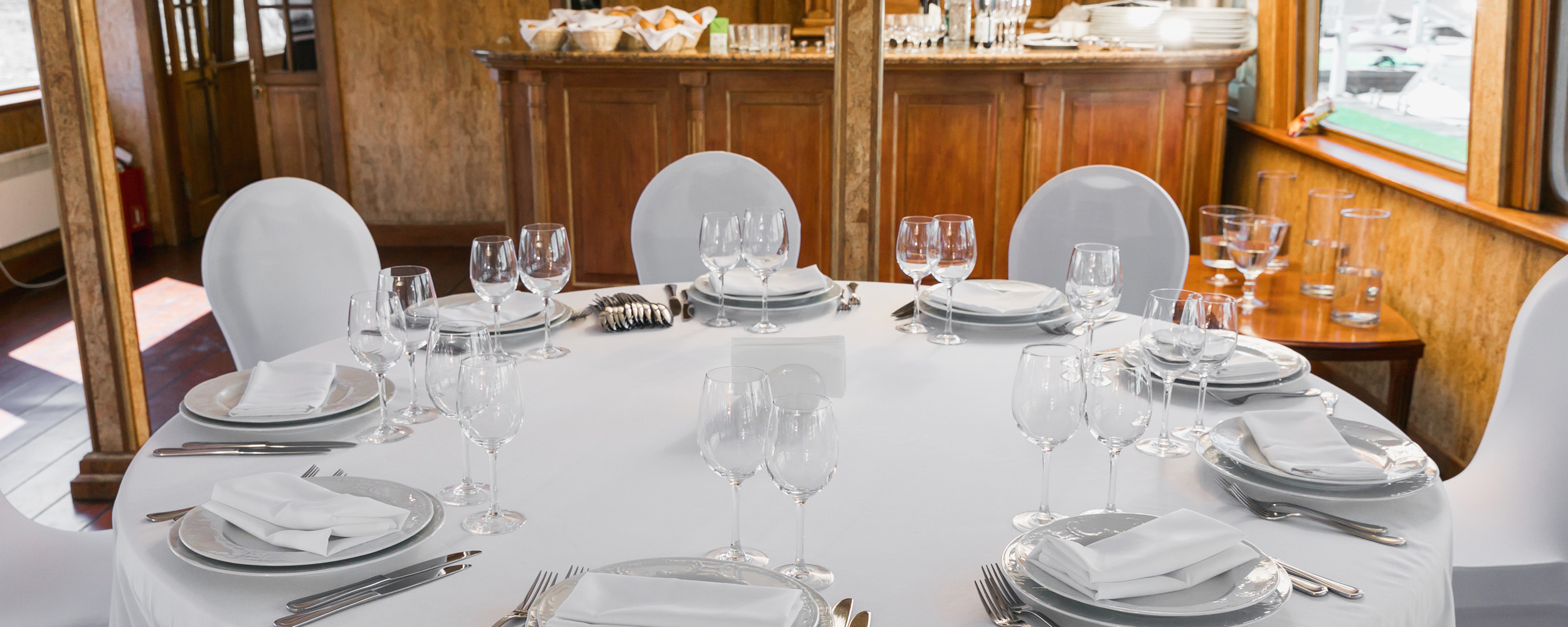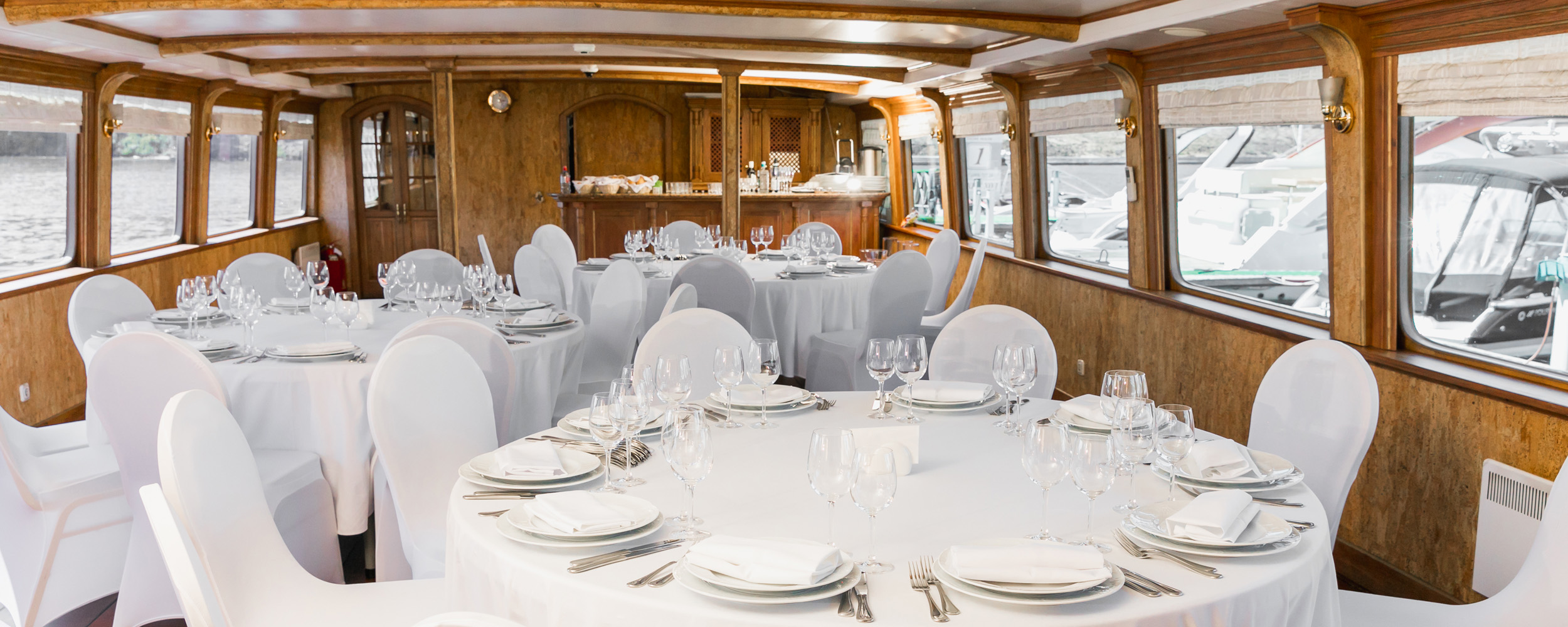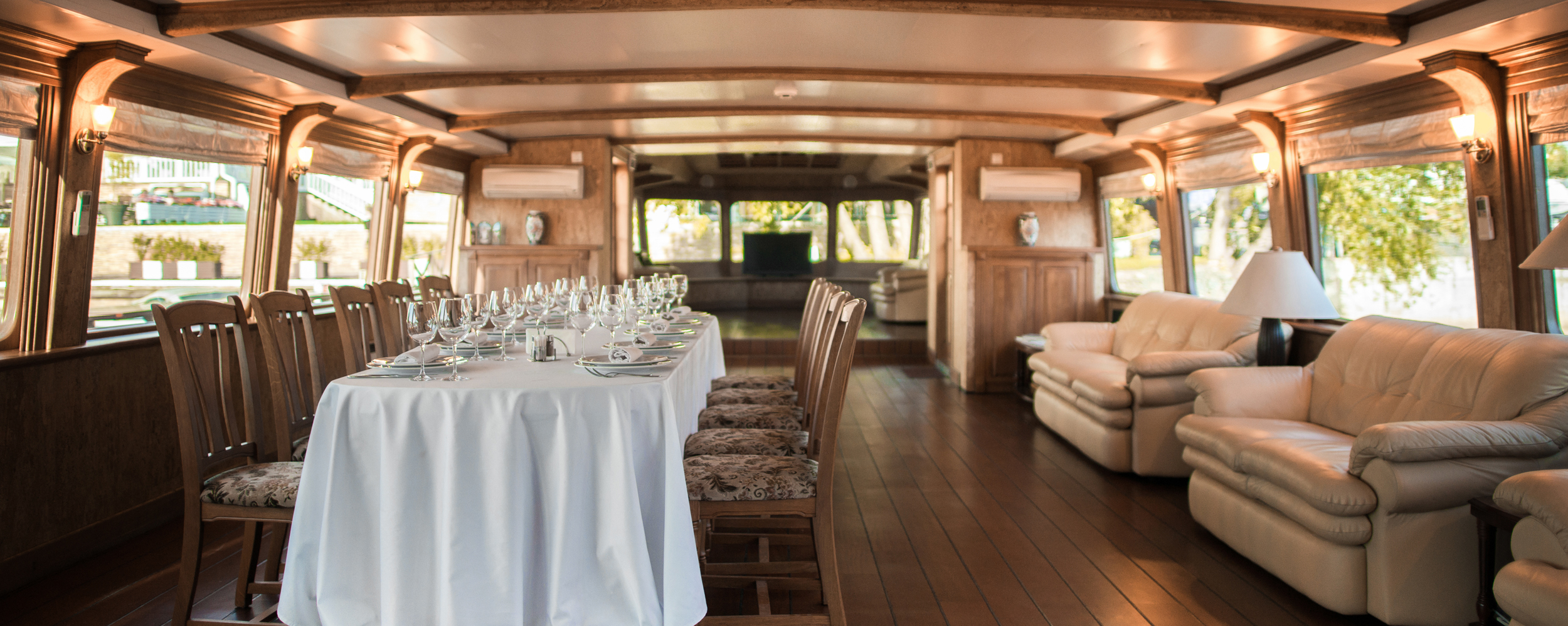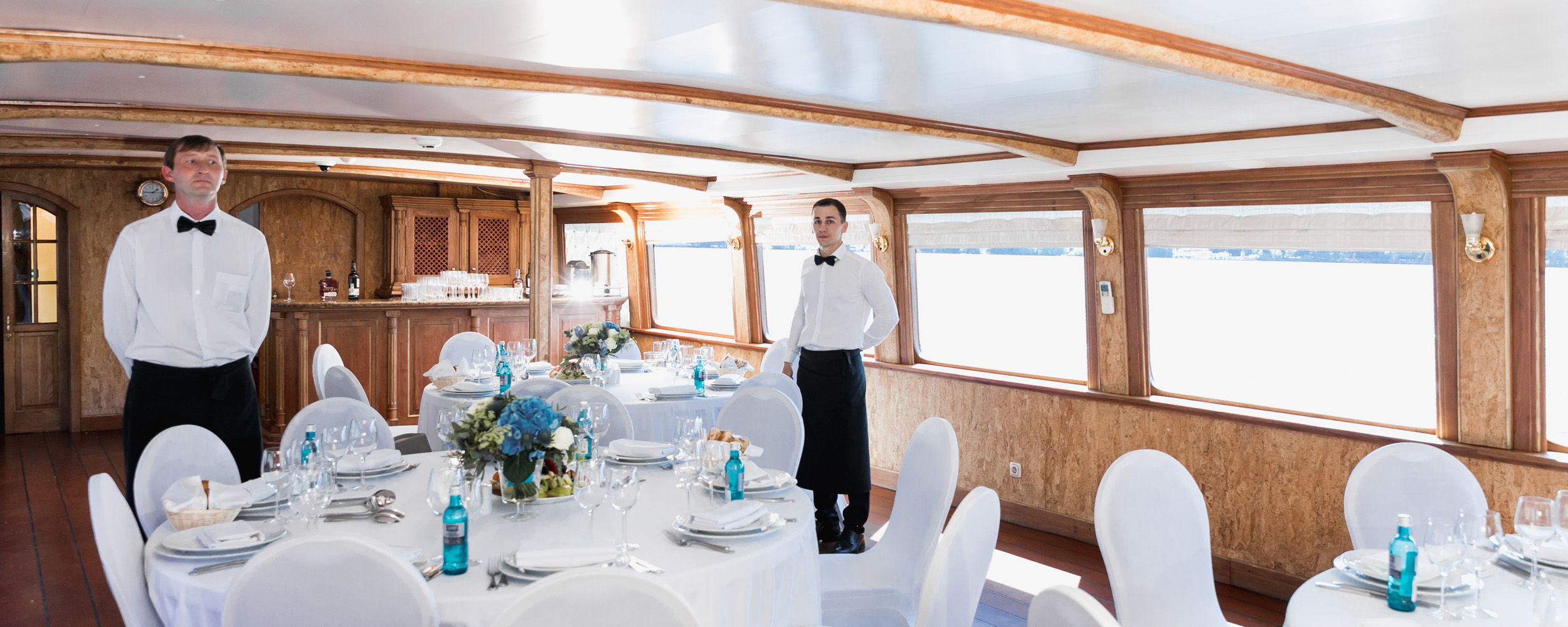 Нижняя палуба – это банкетный зал с баром и танцполом. Интерьер своей дорогой отделкой поддерживает заявленный класс комфортности, а тонированные окна создают полное ощущение приватности.