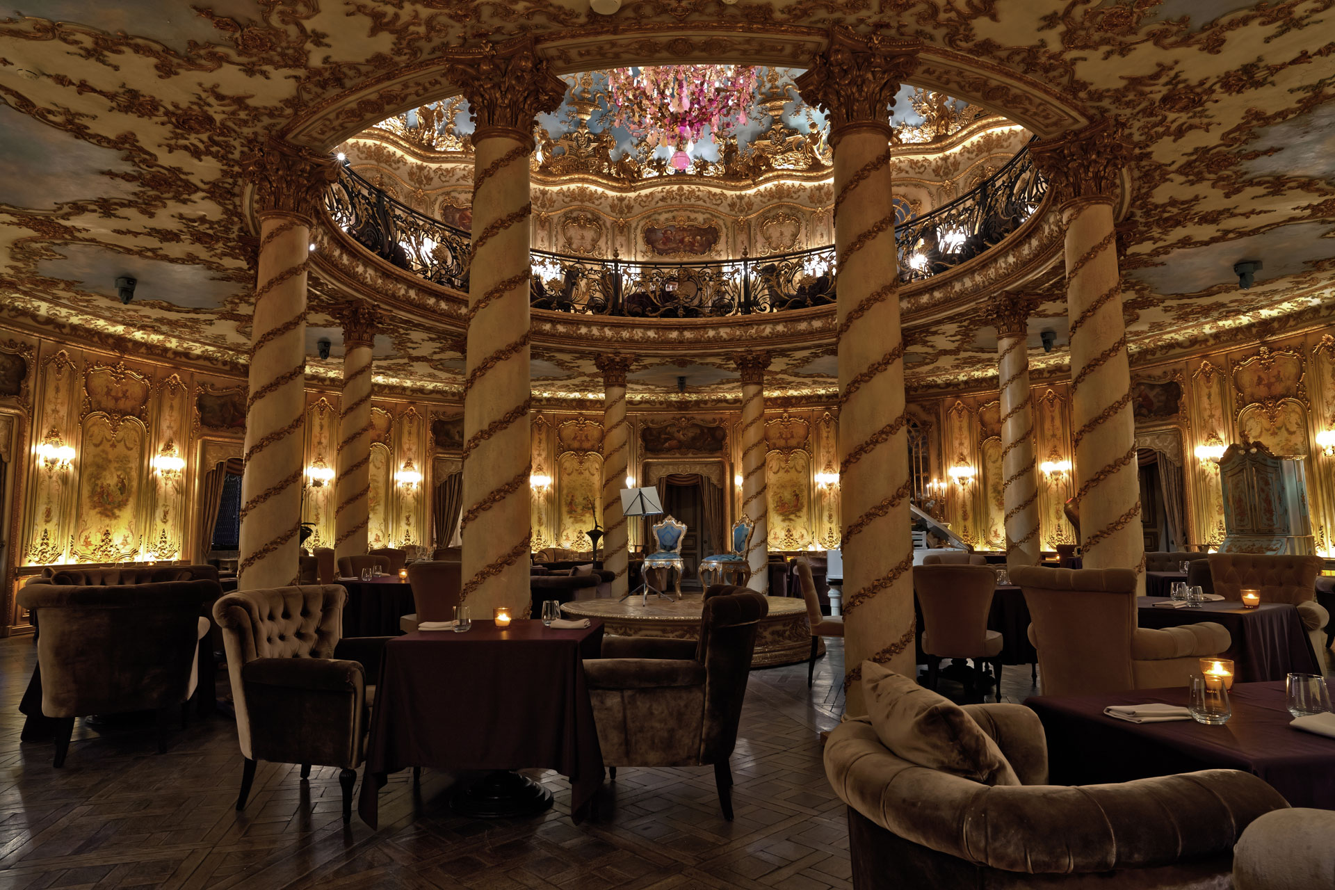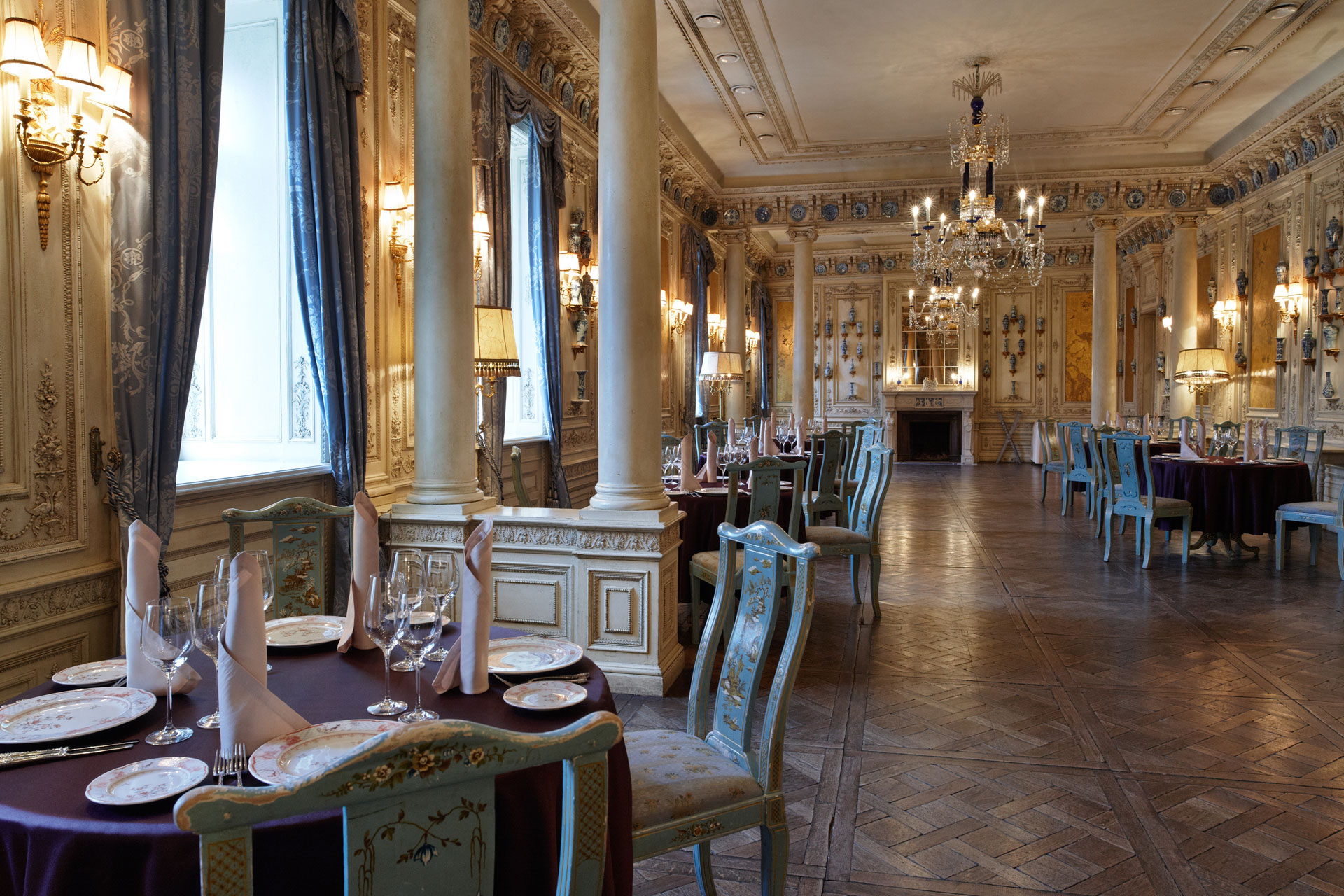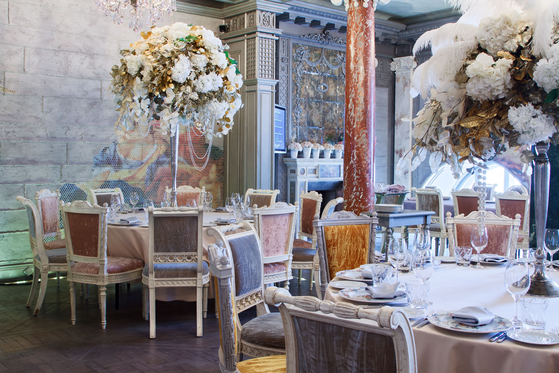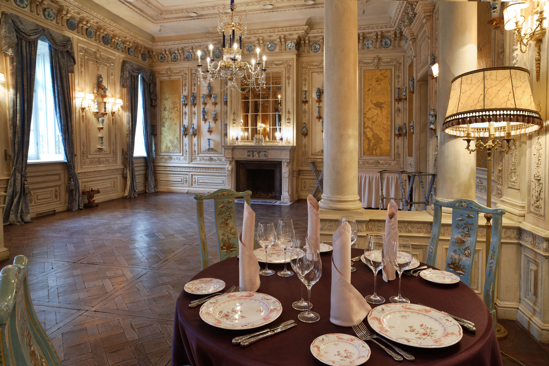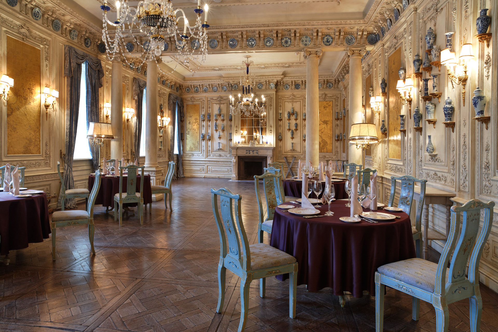 Интерьер ресторана создан в стиле позднего барокко – «шинуазри» (от французского chinois, китайский). Здесь представлены старинные французские гобелены и английские часы, восемь действующих каминов и хрустальная люстра в духе эпохи Людовика XIV, антикварные венецианские зеркала, немецкий фарфор, кованые решетки тульских мастеров-оружейников. Все это гармонично соседствует с барной стойкой из резного стекла, напоминающей футуристический объект или произведение современного искусства.