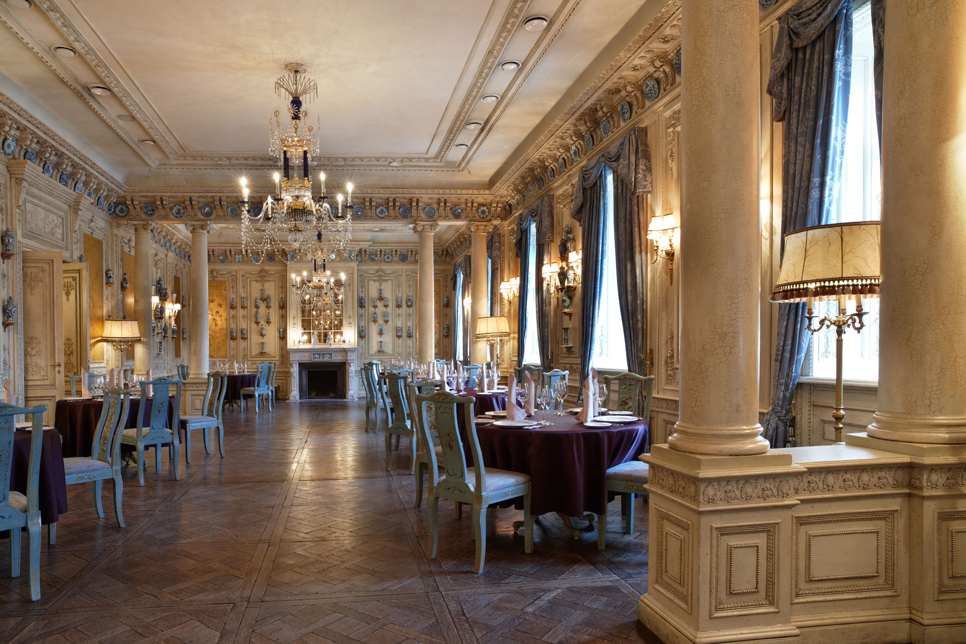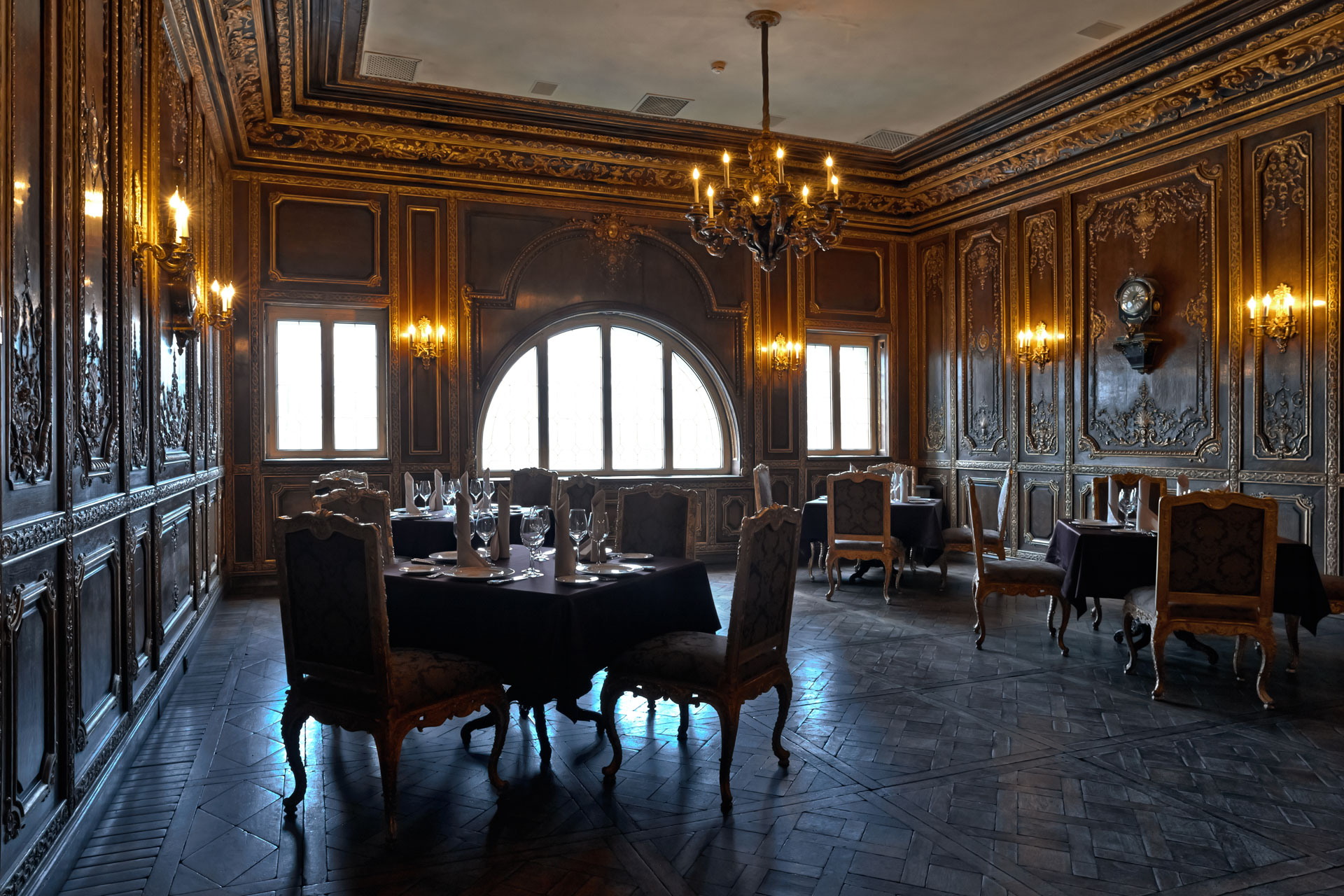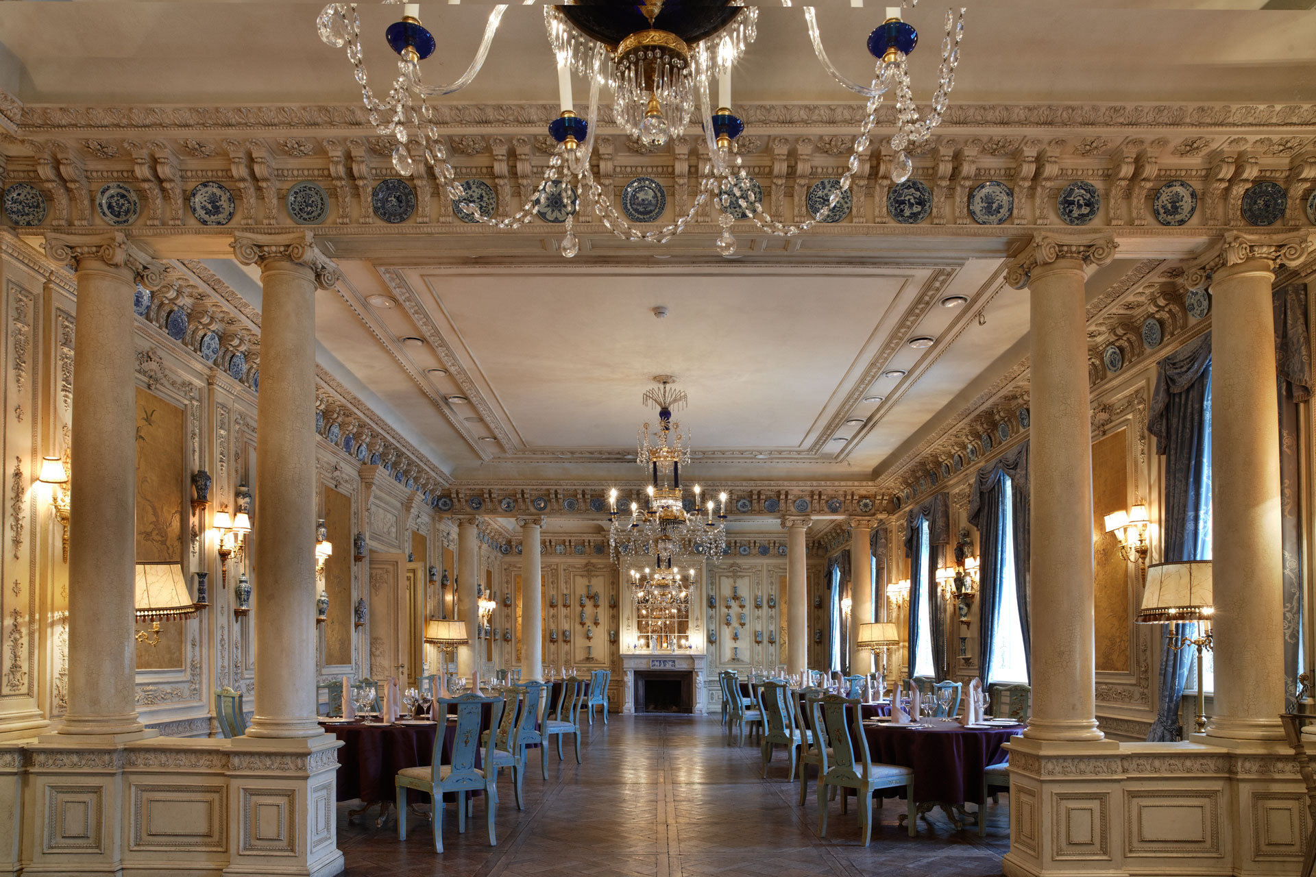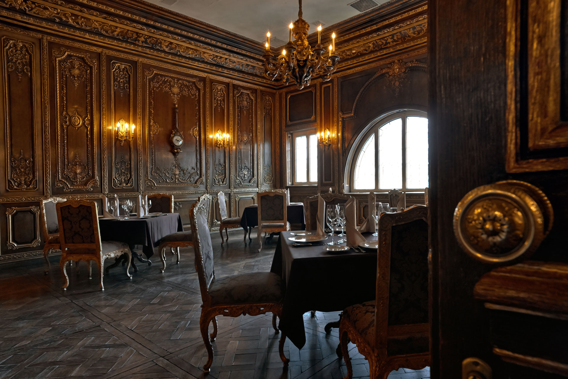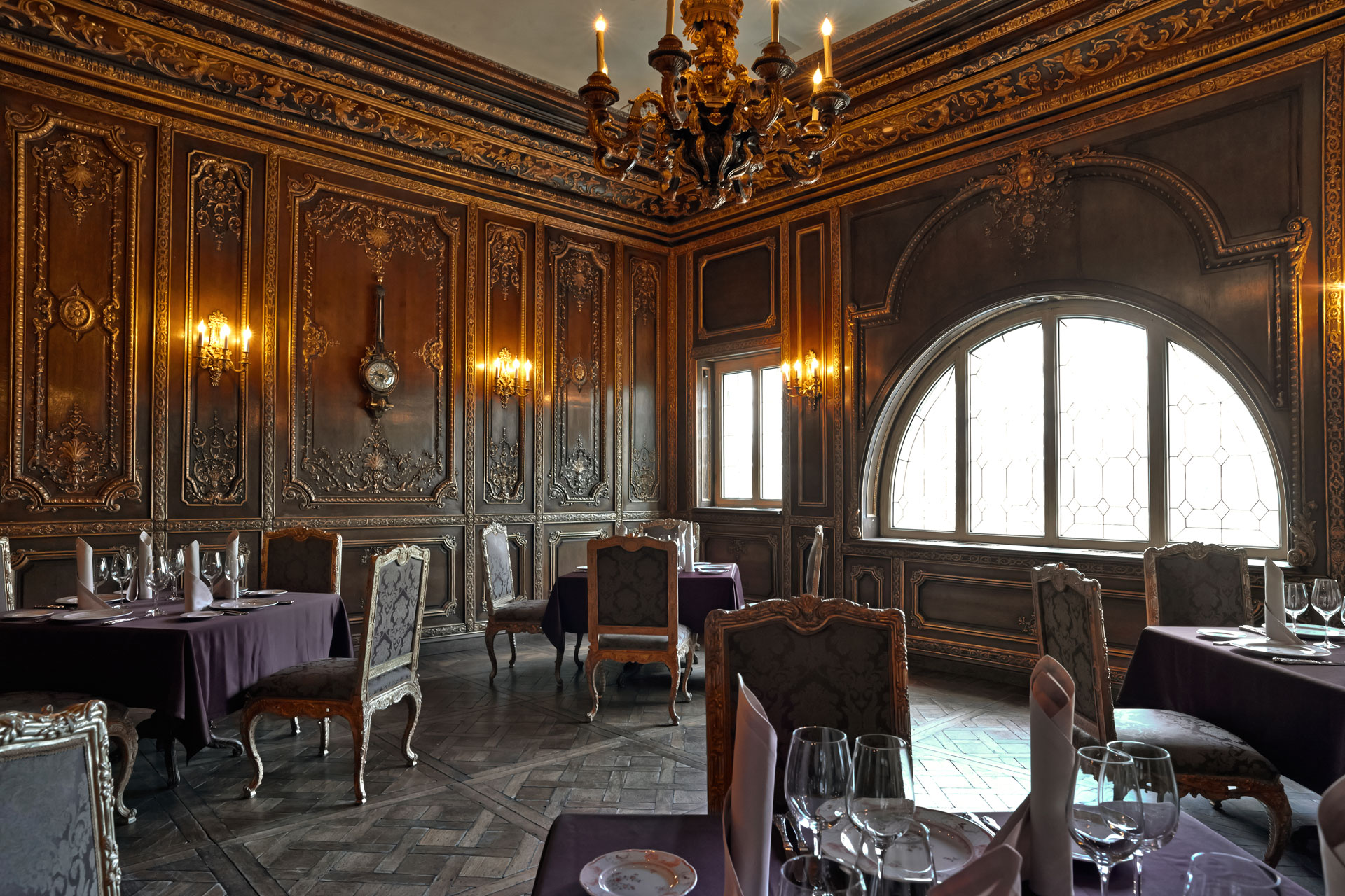 Интерьер ресторана создан в стиле позднего барокко – «шинуазри» (от французского chinois, китайский). Здесь представлены старинные французские гобелены и английские часы, восемь действующих каминов и хрустальная люстра в духе эпохи Людовика XIV, антикварные венецианские зеркала, немецкий фарфор, кованые решетки тульских мастеров-оружейников. Все это гармонично соседствует с барной стойкой из резного стекла, напоминающей футуристический объект или произведение современного искусства.