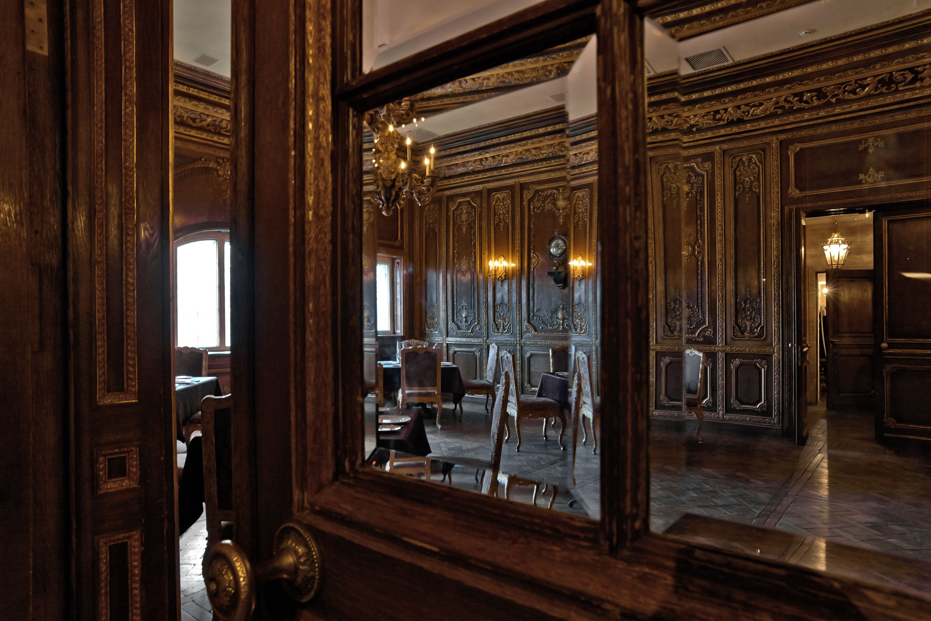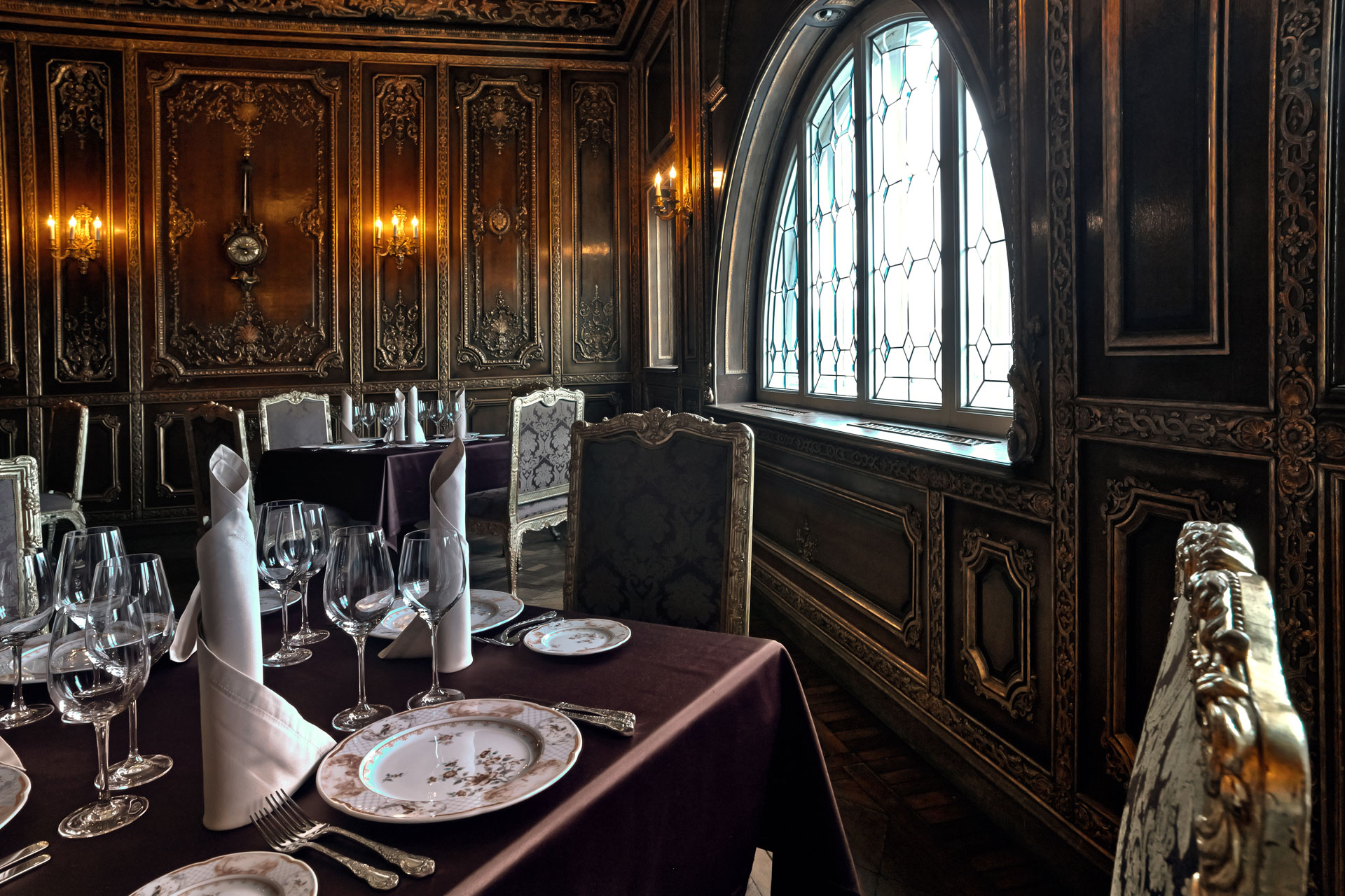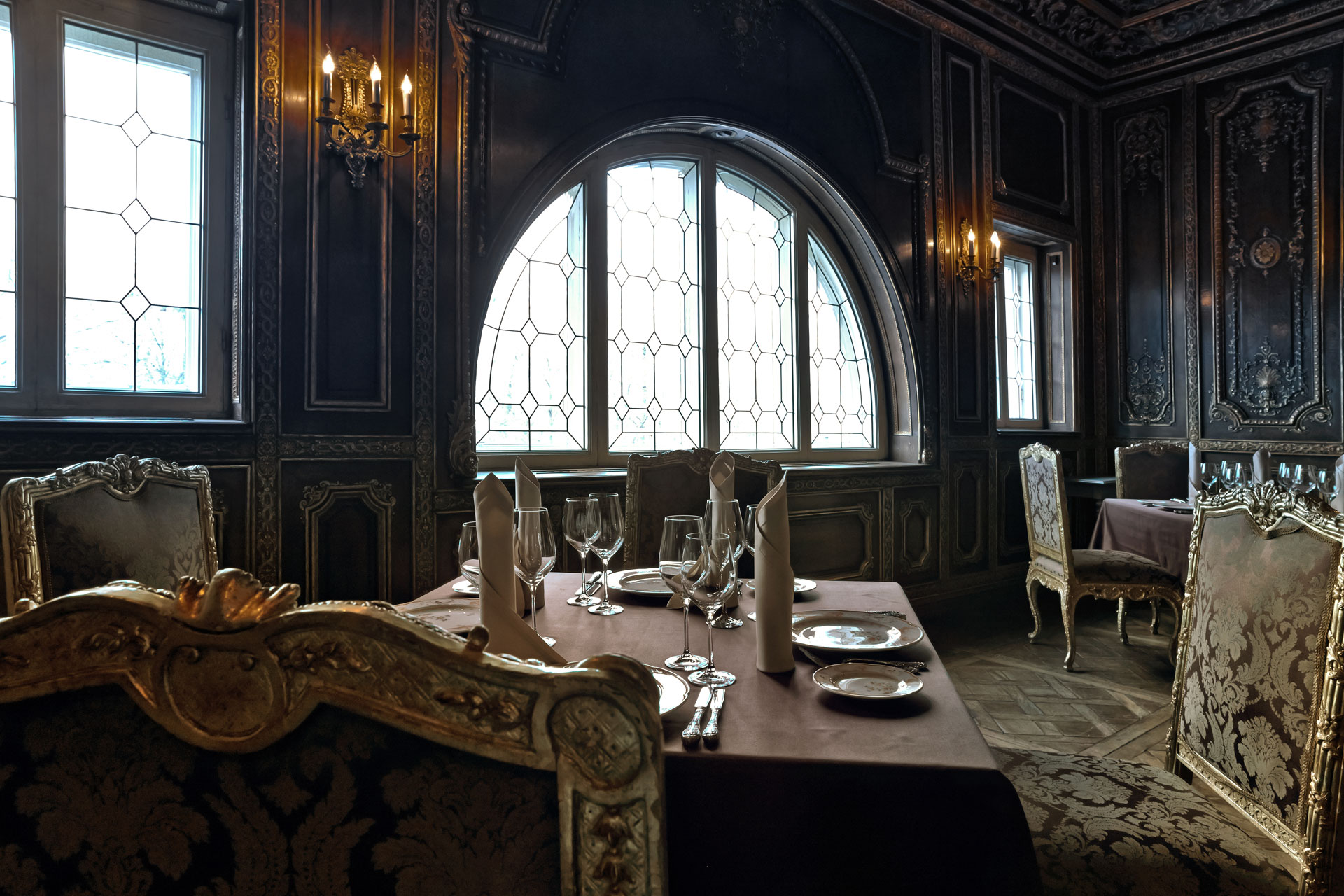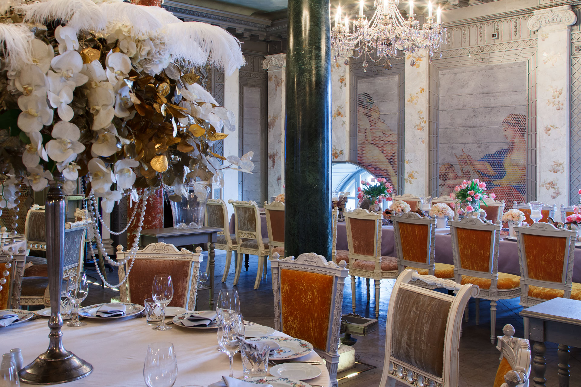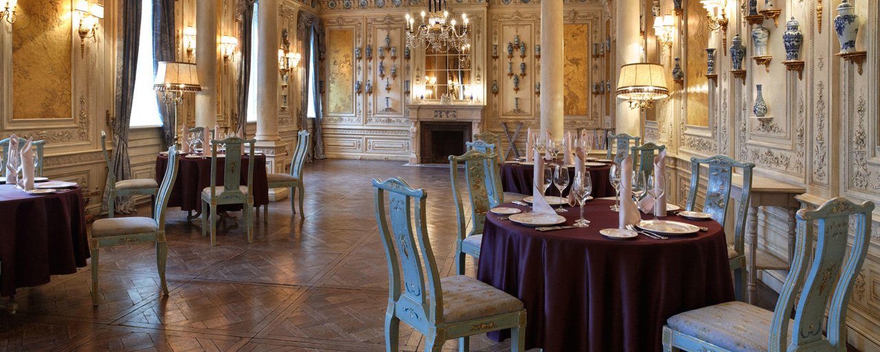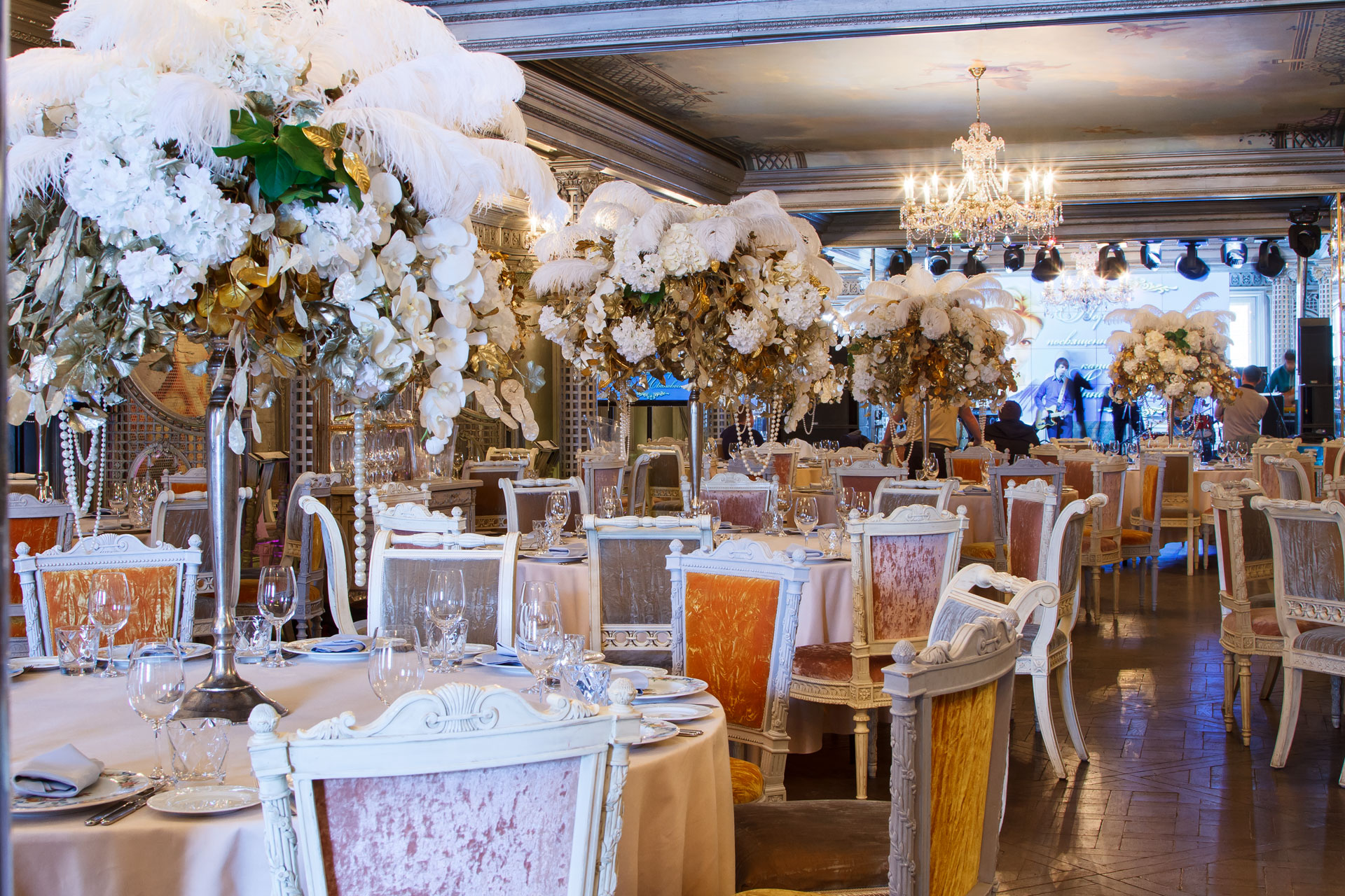 Интерьер ресторана создан в стиле позднего барокко – «шинуазри» (от французского chinois, китайский). Здесь представлены старинные французские гобелены и английские часы, восемь действующих каминов и хрустальная люстра в духе эпохи Людовика XIV, антикварные венецианские зеркала, немецкий фарфор, кованые решетки тульских мастеров-оружейников. Все это гармонично соседствует с барной стойкой из резного стекла, напоминающей футуристический объект или произведение современного искусства.