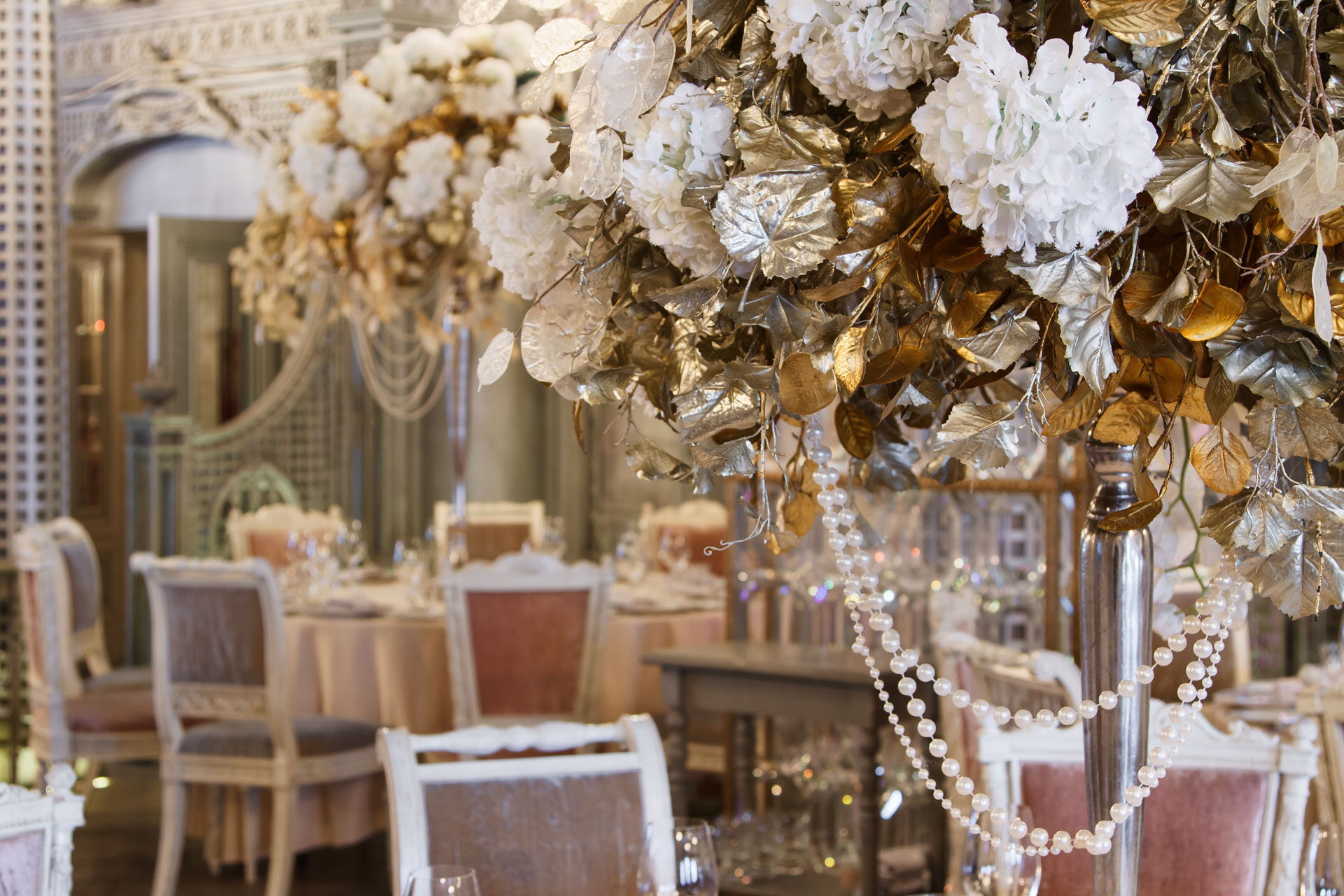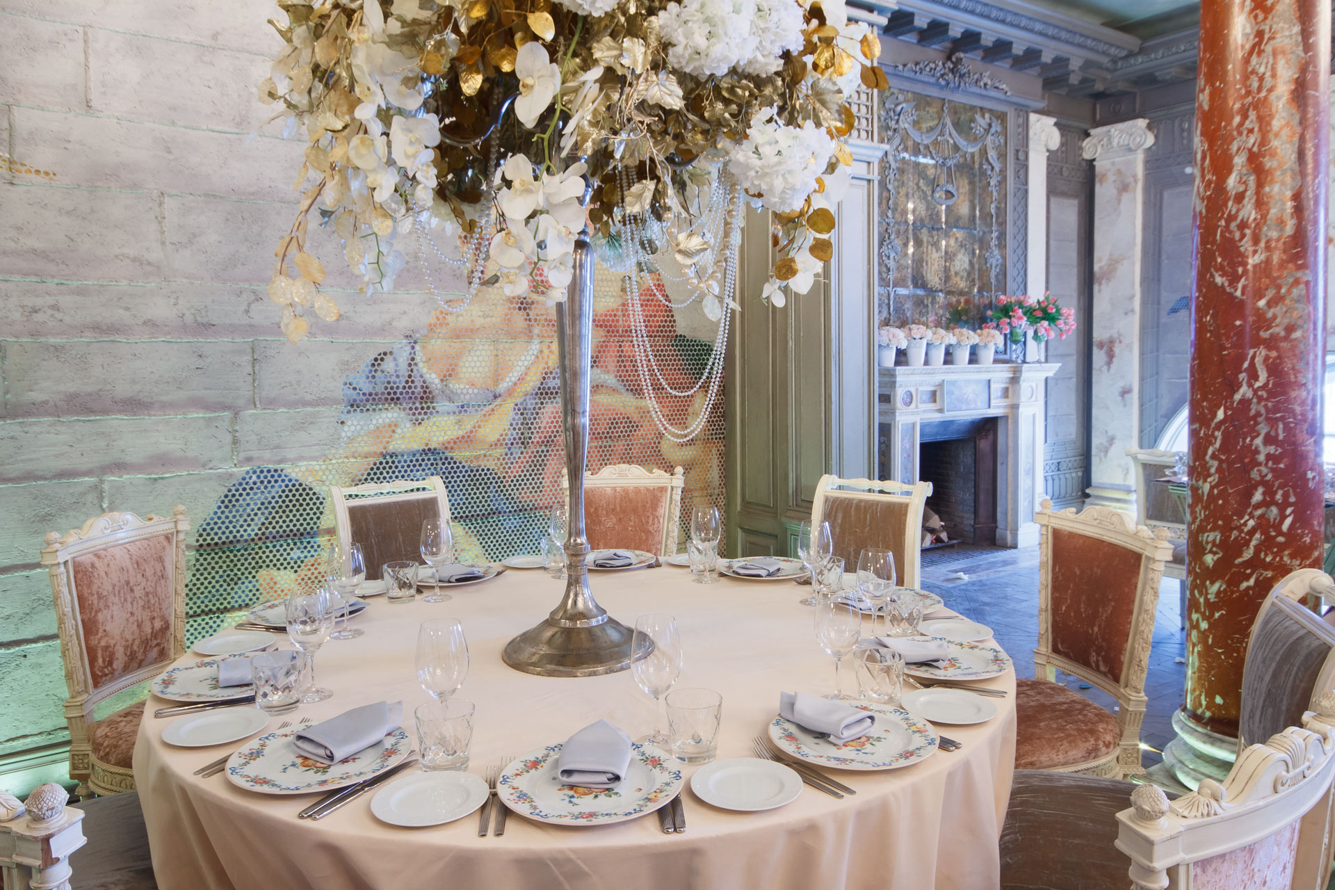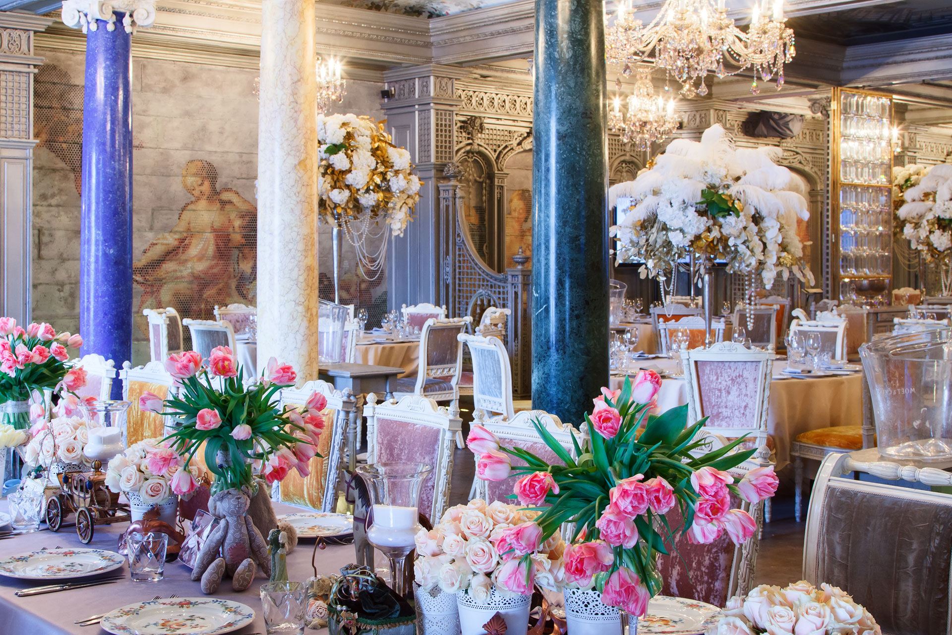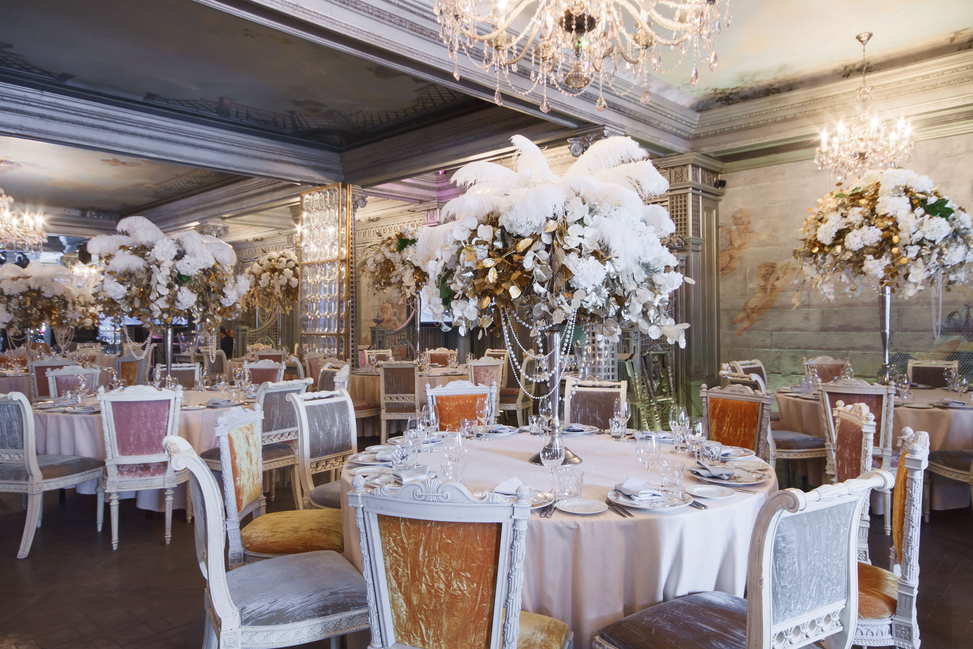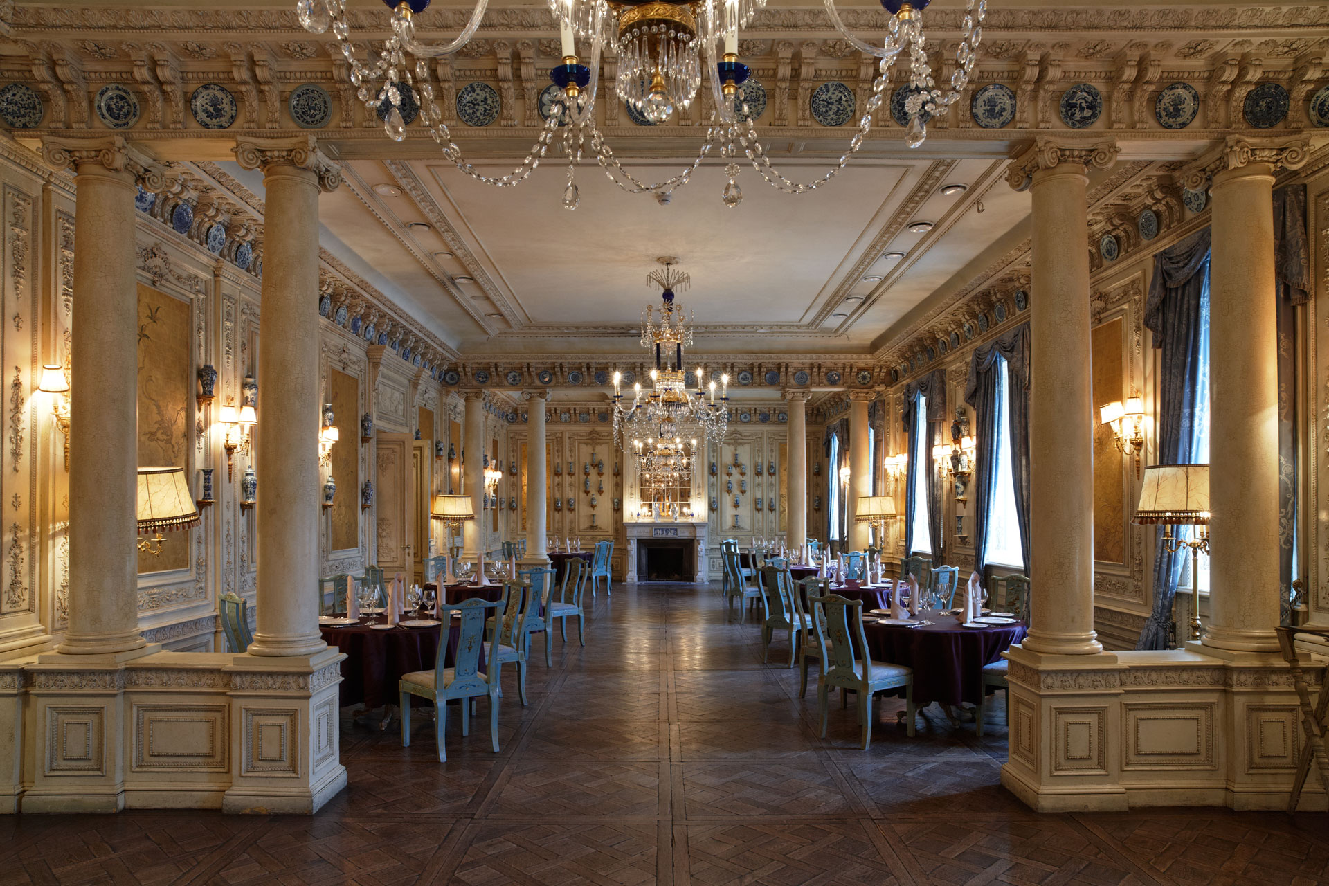 Интерьер ресторана создан в стиле позднего барокко – «шинуазри» (от французского chinois, китайский). Здесь представлены старинные французские гобелены и английские часы, восемь действующих каминов и хрустальная люстра в духе эпохи Людовика XIV, антикварные венецианские зеркала, немецкий фарфор, кованые решетки тульских мастеров-оружейников. Все это гармонично соседствует с барной стойкой из резного стекла, напоминающей футуристический объект или произведение современного искусства.