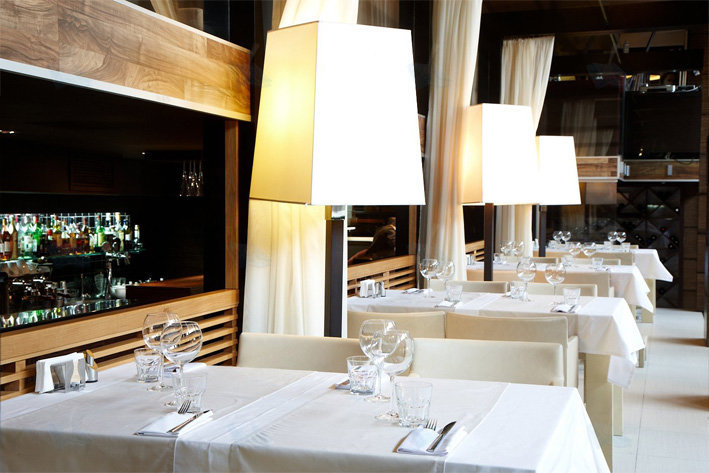 По интерьеру – двухуровневый ресторан «Волна» больше всего напоминает такую оригинальную помесь итальянской траттории с футуристической обстановкой какого-то причудливого космического корабля. Много массивных квадратно-прямоугольных деталей, светильники с яркими инопланетными торшерами, тёплая подсветка в самых неожиданных уголках залов – смотрится всё это как-то необычно. Зато летняя терраса ресторана выполнена в жизнеутверждающем итальянском стиле, и сидеть тут, мечтательно глядя, на расстилающуюся вблизи гладь Невы одно удовольствие…