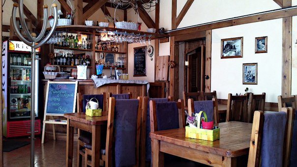 Помещение оформлено в теплых коричневых тонах и полностью обставлено деревянной мебелью. На окнах – легкие и светлые гардины, на стенах расположились фотографии и натюрморты в деревянных рамках. Зал ресторана изобилует комнатными растениями, а на некоторых столиках и подоконниках можно увидеть даже клетки с птицами. Все это гармонично сочетается между собой, воссоздавая уютную домашнюю атмосферу.