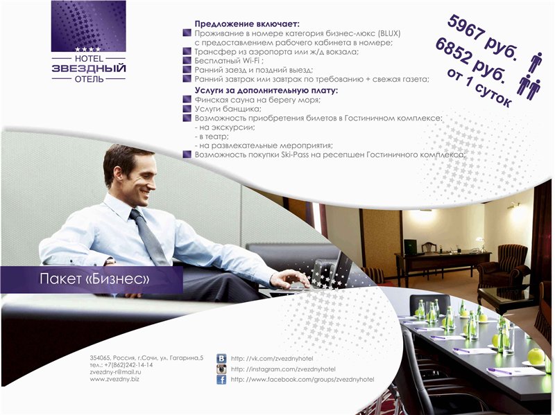 конгрессное обслуживание: бизнес-центр, современный конференц-зал вместимостью 65 человек, оборудованные офисной мебелью офисные помещения разнообразной планировки, презентационное оборудование от компьютеров и видеопроекторов до маркерных досок.