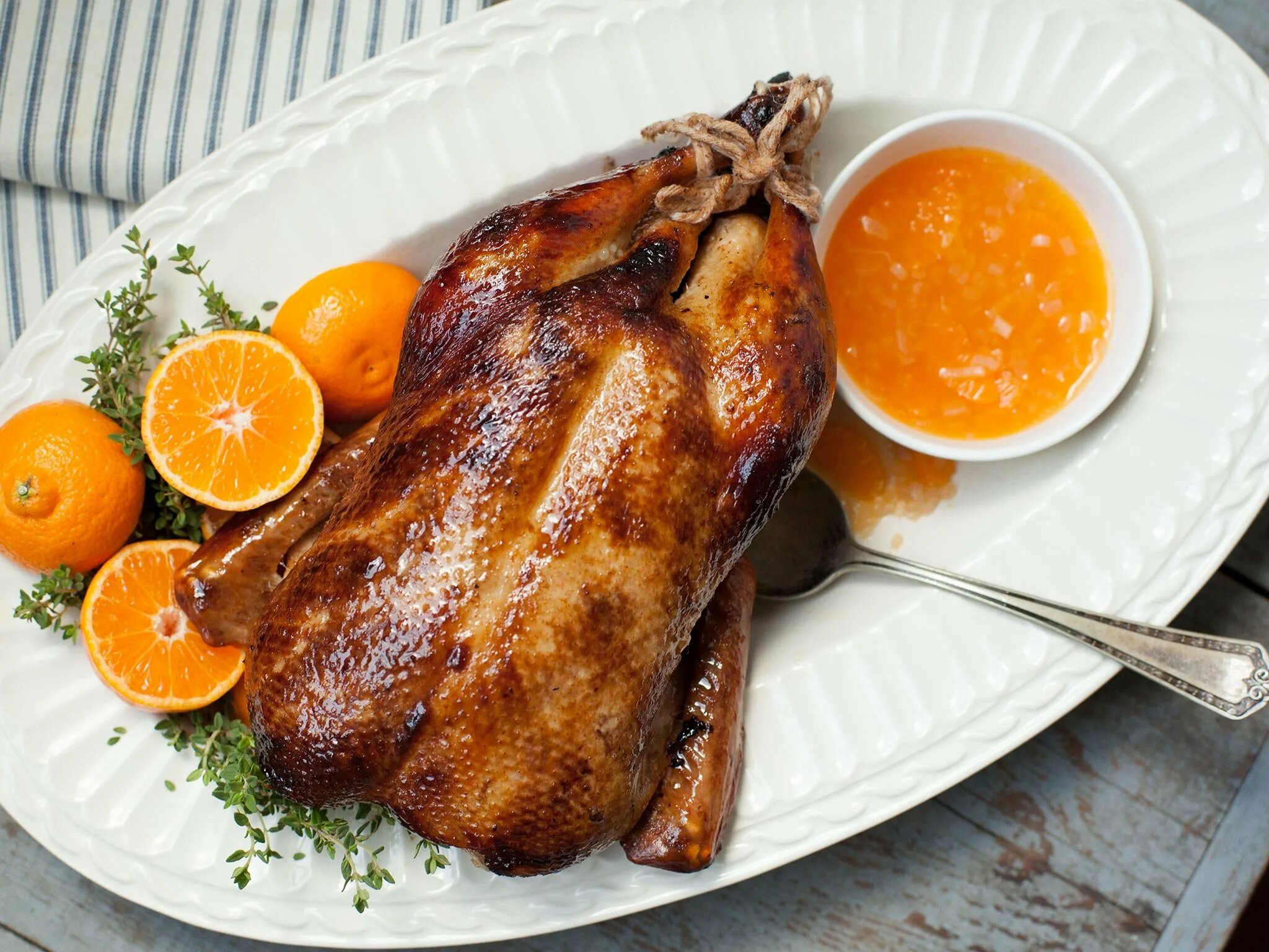 - по этому же принципу можно приготовить утку, добавив в маринад порезанный с кожурой апельсин и уменьшив количество растительного масла. т. к. утка и так жирная. Утку лучше всего запекать в рукаве — 1,5-2 часа. Должно получиться что-то похожее на утку конфи по-пекински