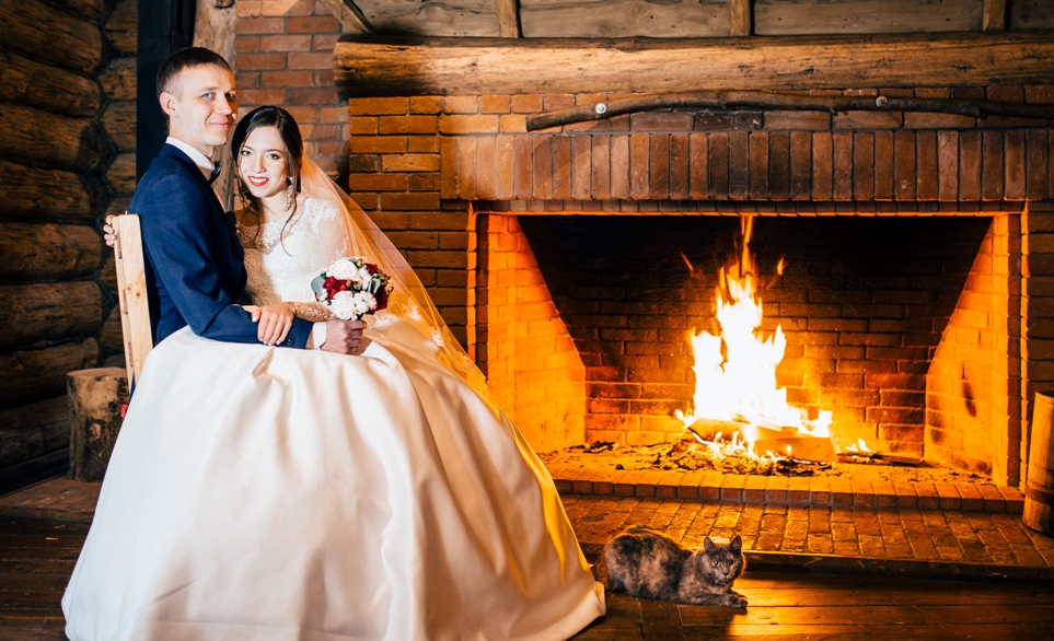 2. Свадебная фотозона у камина. Создайте внутри банкетного зала или в отдельной беседке уютный уголок с меховыми пледами, стилизованными санками, корзинами с шишками и гирляндами. Это станет притягательным местом для красивых и атмосферных групповых фото гостей.