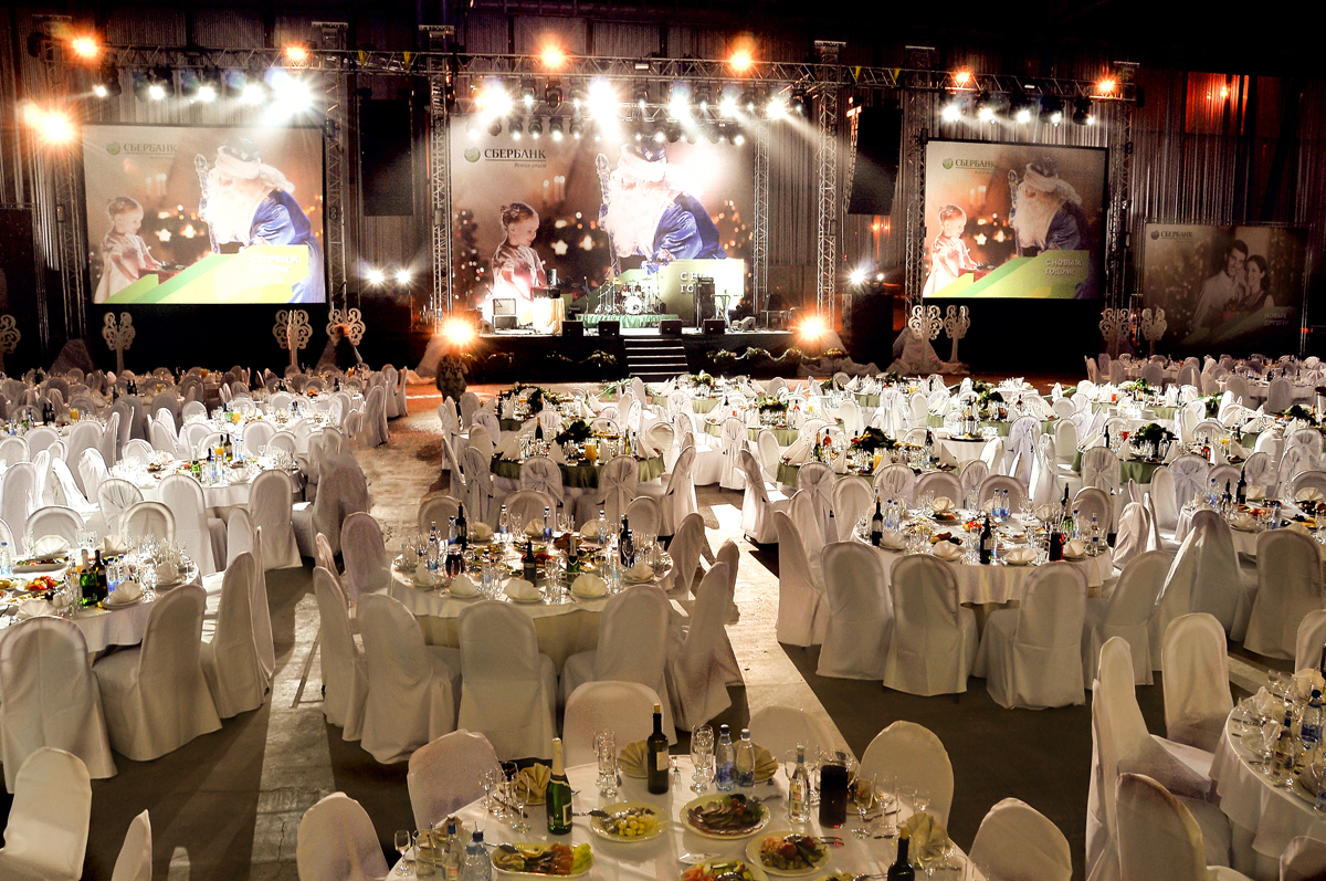 - Сцена и проекция: Высокая и заметная со всех точек сцена. Обязателен как минимум один большой экран (или несколько) для трансляции поздравлений, фото и видео-контента.