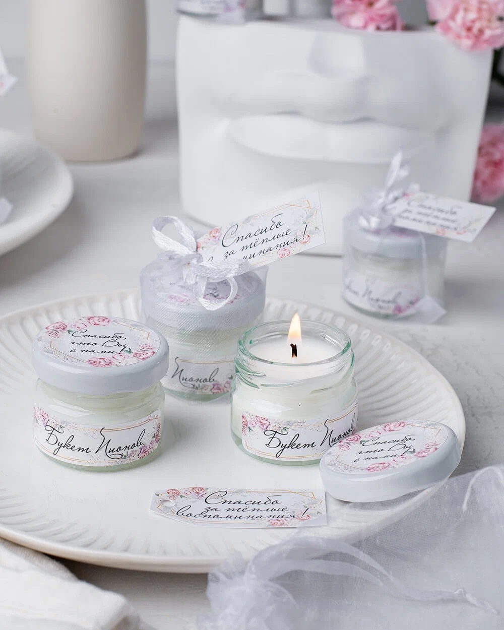 - Аромасвечи с «вашим» запахом (например, «Море + шампанское = наша свадьба»).