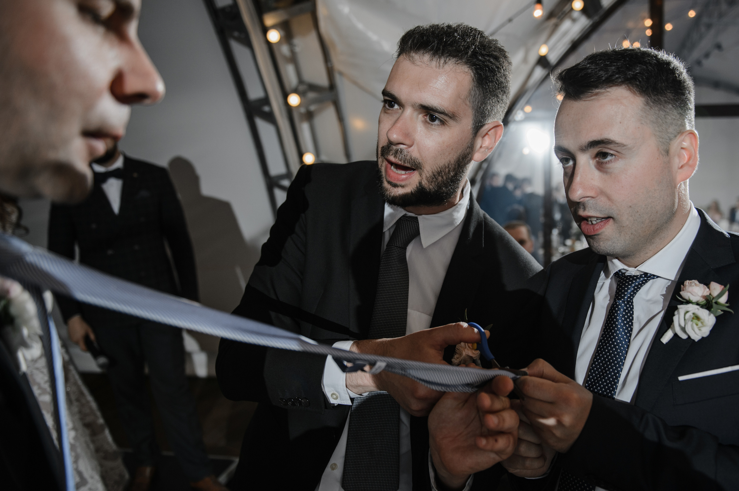 Традиция с галстуком имеет не менее интересную историю. В древности считалось, что предметы одежды жениха обладают особой силой. Гости старались оторвать кусочек его наряда «на память» — якобы это приносило удачу. Чтобы не остаться в клочьях к концу праздника, женихи стали приносить запасной галстук, который потом разрезали на части для всех желающих.