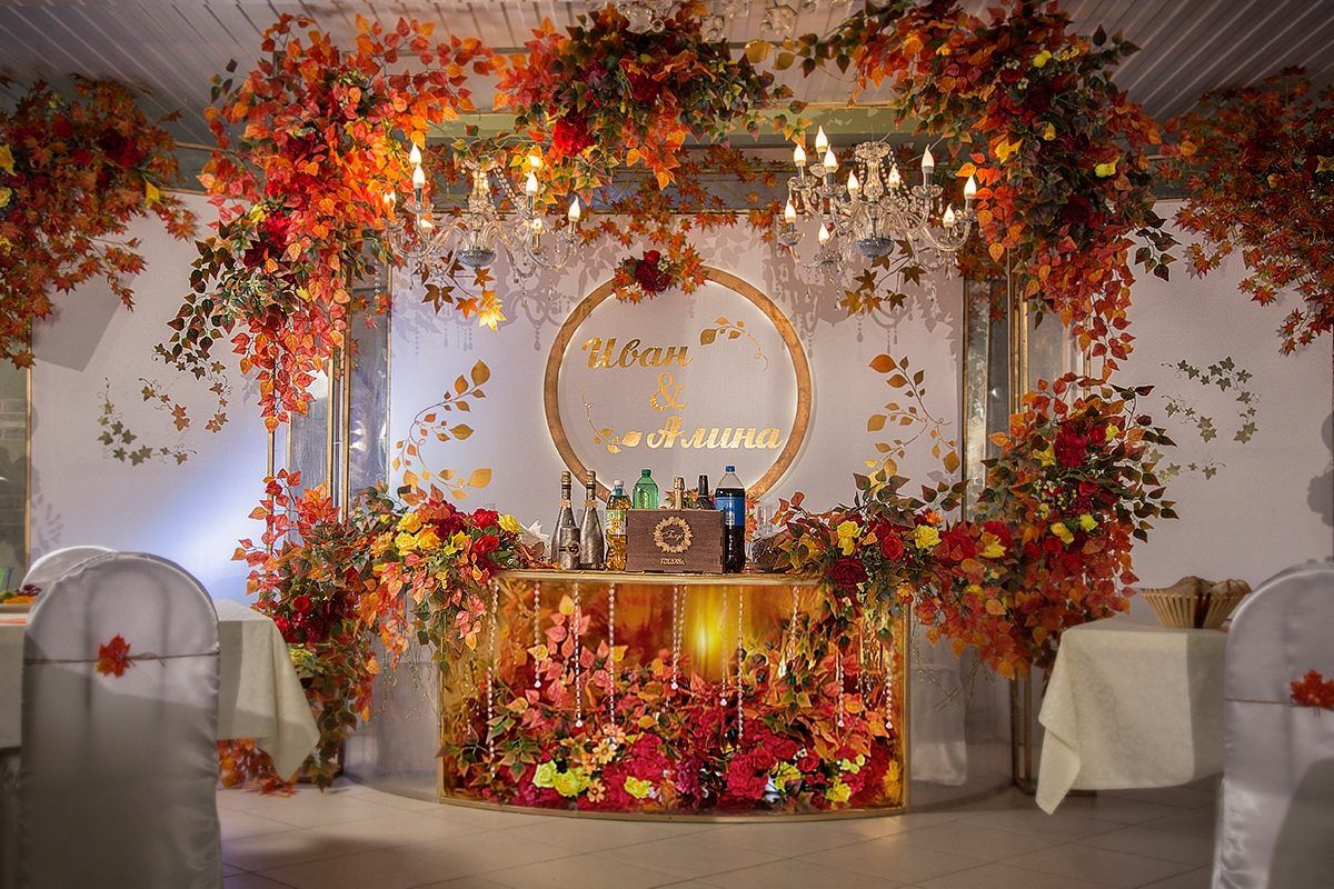 Ещё одна пара — Артём и Виктория — превратили свою свадьбу в праздник осеннего кино: гостей встречали попкорном и какао, а вместо альбома для пожеланий был огромный холст, где каждый оставлял отпечаток руки с пожеланиями. Банкетный зал украшали гирлянды, тыквы и книги — получилось очень душевно.