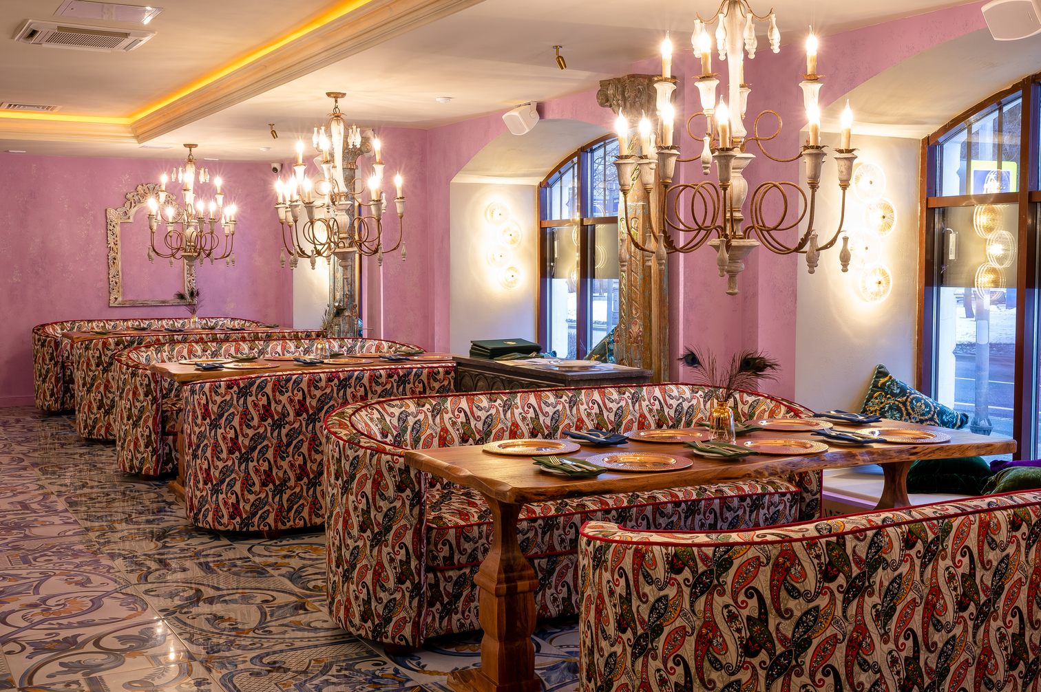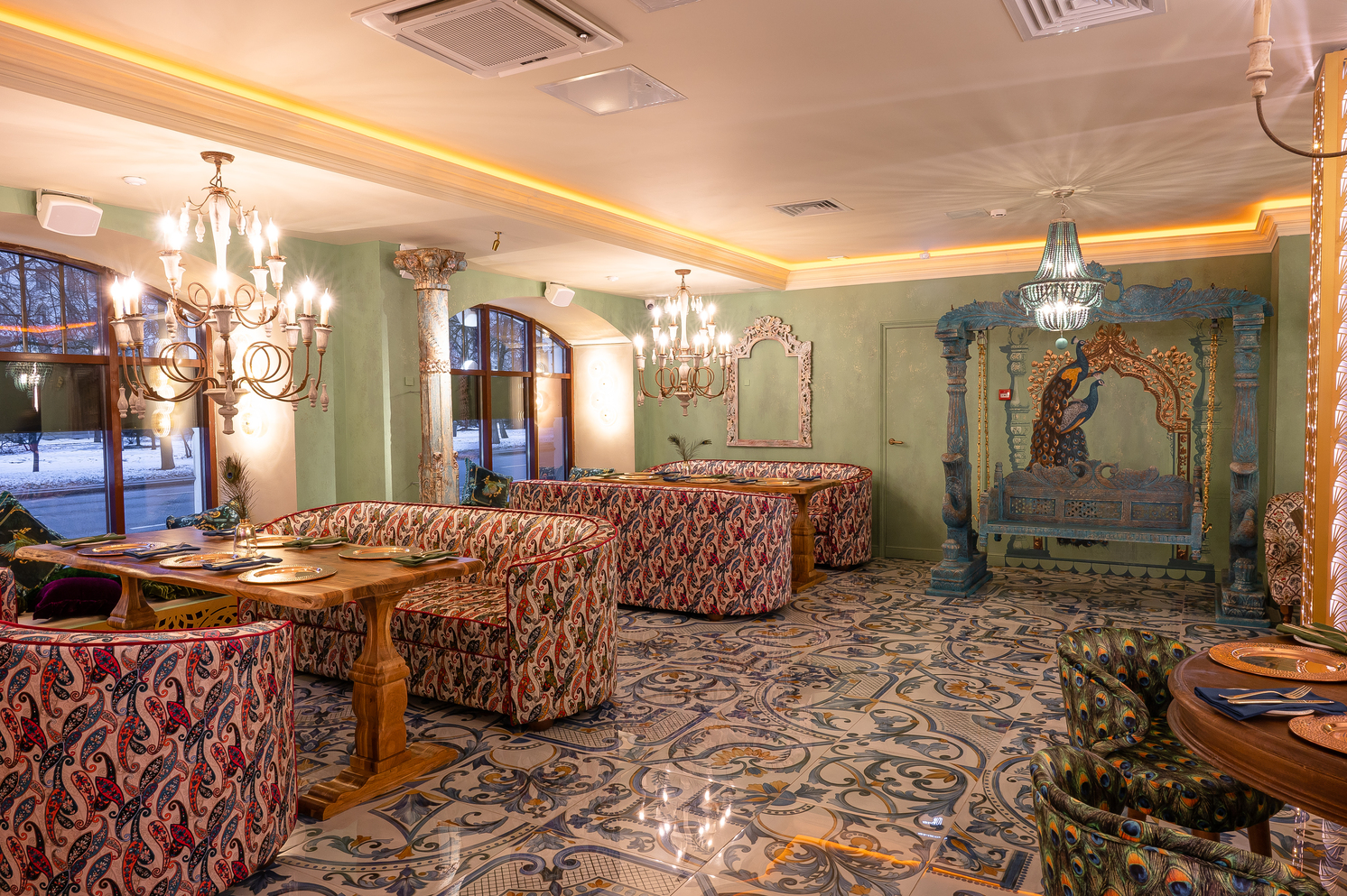 Пространство ресторана сочетает элементы традиционной индийской архитектуры с современным дизайном: тёплые тона, натуральные материалы, богатые текстуры тканей, резьба по дереву и бронзовые элементы создают атмосферу индийской роскоши и уюта.