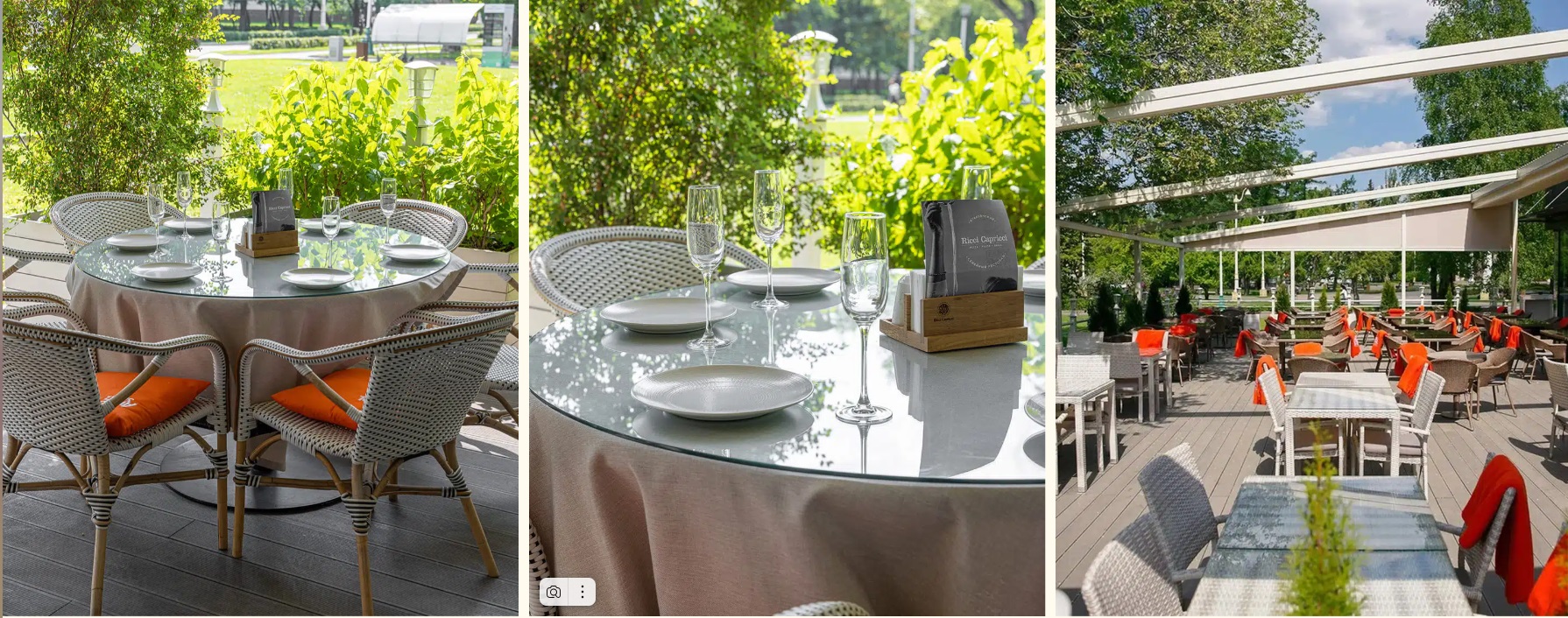 - Летняя терраса на 80 человек, утопающая в зелени, — идеальный вариант для праздника под открытым небом в тёплое время года.